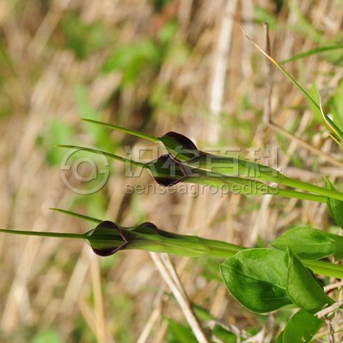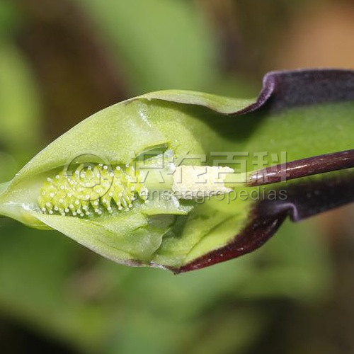 块茎圆球形,直径1-2厘米,具须根。叶2-5枚,有时1枚。叶柄长15-20厘米,基部具鞘,鞘内、鞘部以上或叶片基部(叶柄顶头)有直径3-5毫米的珠芽,珠芽在母株上萌发或落地后萌发;幼苗叶片卵状心形至戟形,为全缘单叶,长2-3厘米,宽2-2.5厘米;老株叶片3全裂,裂片绿色,背淡,长圆状椭圆形或披针形,两头锐尖,中裂片长3-10厘米,宽1-3厘米;侧裂片稍短;全缘或具不明显的浅波状圆齿,侧脉8-10对,细弱,细脉网状,密集,集合脉2圈。花序柄长25-30(-35)厘米,长于叶柄。佛焰苞绿色或绿白色,管部狭圆柱形,长1.5-2厘米;檐部长圆形,绿色,有时边缘青紫色,长4-5厘米,宽1.5厘米,钝或锐尖。肉穗花序:雌花序长2厘米,雄花序长5-7毫米,其中间隔3毫米;附属器绿色变青紫色,长6-10厘米,直立,有时“S”形弯曲。浆果卵圆形,黄绿色,先端渐狭为明显的花柱。花期5-7月,果8月成熟。