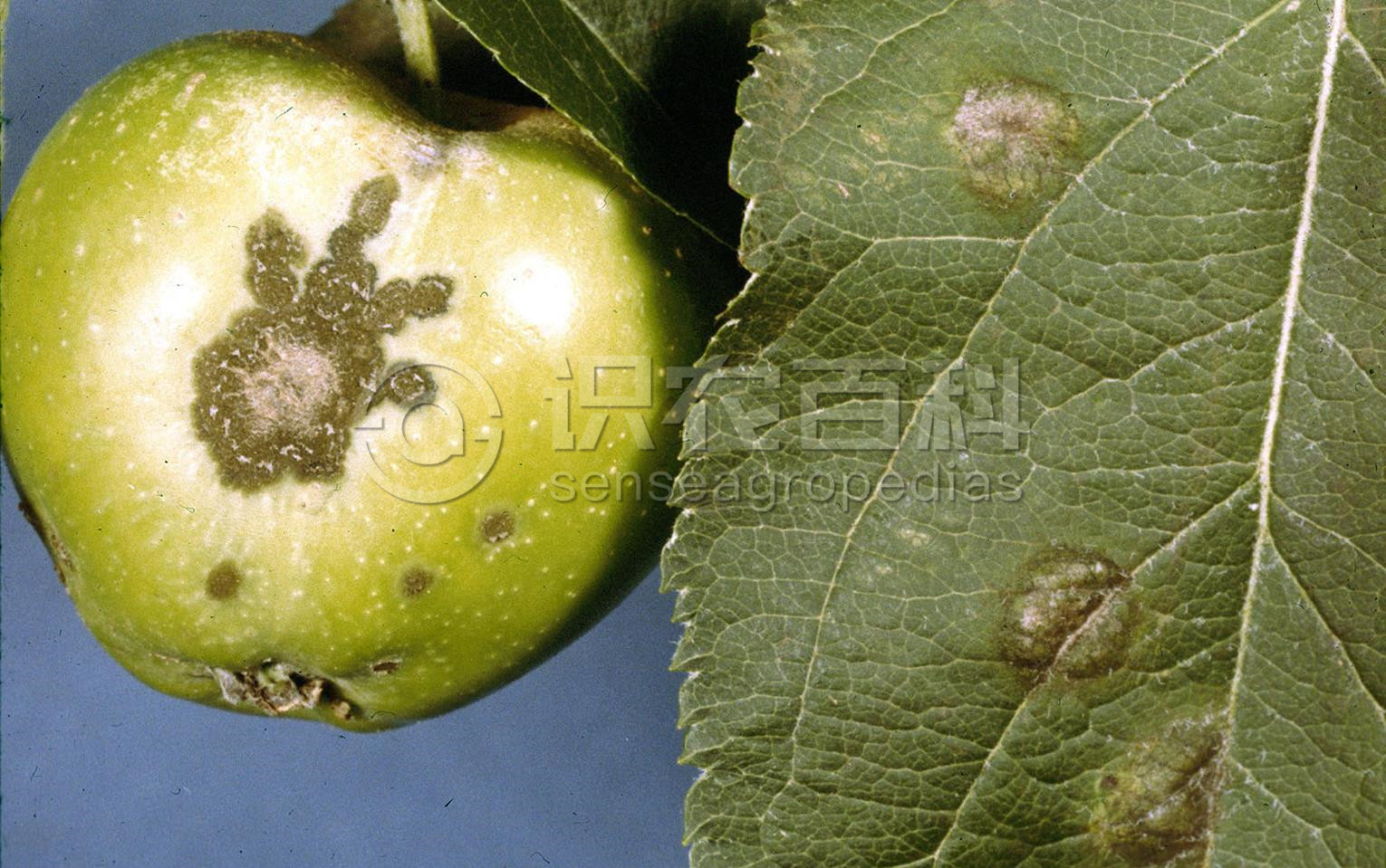 主要为害叶和果实。叶片正面初为淡黄绿色圆形或放射形斑,后变褐至黑色,并产生黑色绒毛状霉。重病时叶小、厚、卷曲,多数病斑连在一起后叶片干枯脱落,叶柄有黑色长条状斑。幼果多在萼片处受侵,症状不明显。果实受害,产生近圆形淡绿色斑点,后变黑色,表面着生黑色绒毛状霉,病斑凹陷,硬化,龟裂,畸形,常呈星状开裂。