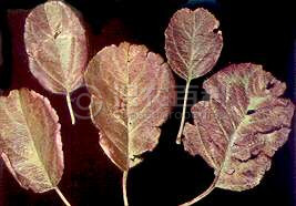 枝条细弱而且分枝少。叶色暗绿色或青铜色,近叶的叶面上呈现紫褐色斑点或斑块,这种症状从基部叶向顶部叶波及;生长期、生长较快的新梢叶呈紫红色;叶柄与枝条呈锐角。