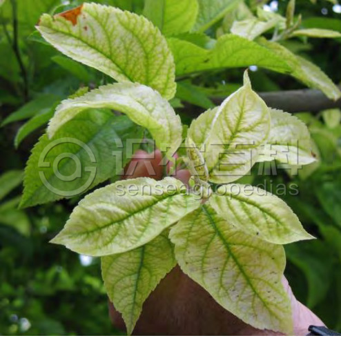 选用抗性强砧木。增施有机肥改良土壤,增加土壤中铁的可用性。冬季结合深翻改土,每株结果树施用硫酸亚铁0.5千克,施入后在沟内灌水。萌芽初期喷布0.3%-0.5%的硫酸亚铁溶液。近发芽前,用强力树干注射机向树体注射硫酸亚铁酸化水溶液,pH值调到3.8-4.4。干周40厘米以上的失绿树每株注射硫酸亚铁20-30克,有效期可维持5年以上。