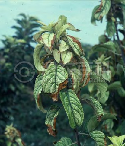 苹果缺铁开始叶肉先变黄,而叶脉两侧保持绿色,引起叶面呈绿色网纹状失绿。随病势发展,叶片失绿程度加重出现整叶变为白色,叶缘枯焦,引起落叶。严重缺铁时新梢顶端枯死,呈枯稍现象,影响树木正常生长发育,引起早衰,致树体抵抗不良环境能力减弱,易遭受冻害或引起其它病害发生。
