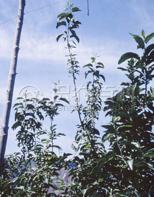 苹果缺锌最典型的症状是小叶病,即春季新梢顶端生长一些狭小而硬、叶呈黄绿色的簇生叶,而新梢其它部位较长时间没有叶片生出,或中、下部叶叶尖和叶缘变褐焦枯,从下而上早落,形成光腿现象。也有从顶端下部另发新枝,但仍表现节间短,叶细小。花芽减少,花朵少而色淡,不易坐果。老树根系有腐烂,树冠稀疏不能扩展,产量很低。