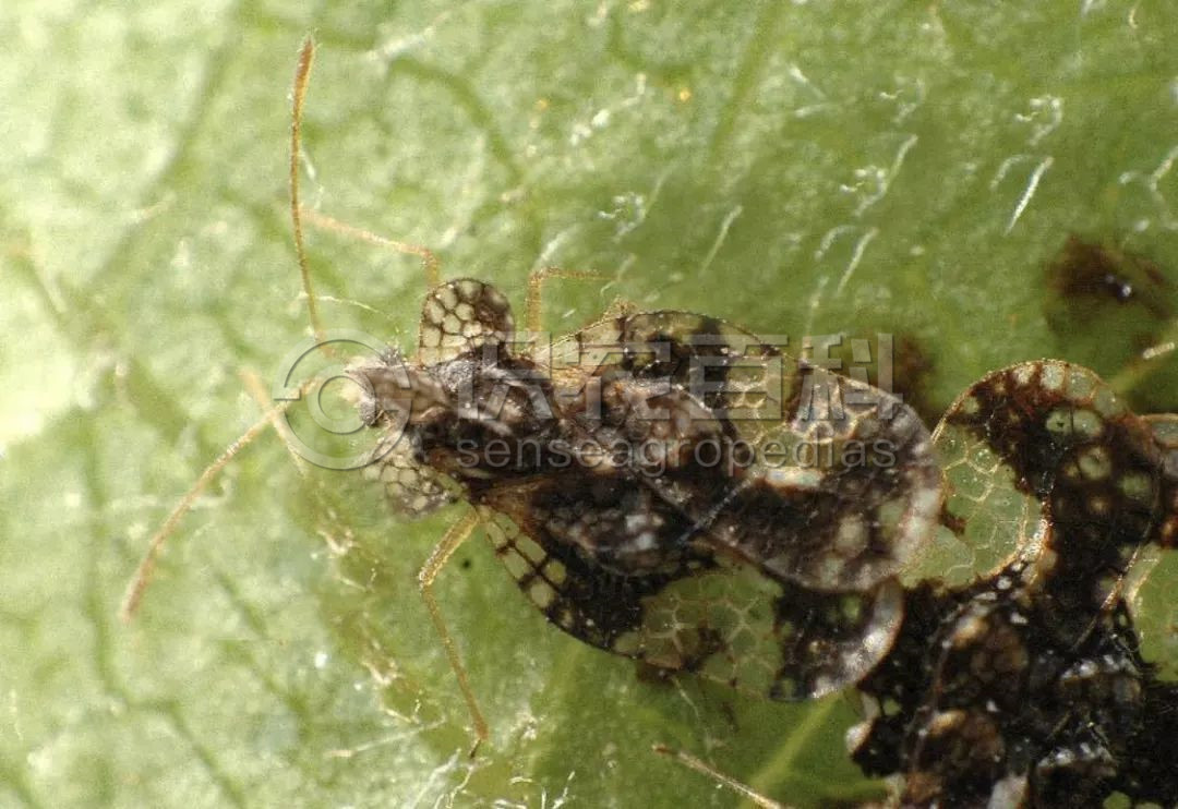 梨冠网蝽又名军配虫、梨网蝽。可为害苹果、梨、花红、海棠、山楂、桃、李、杏、樱桃等多种果树。以成虫和若虫群集于叶背主脉附近刺吸汁液,被害处叶片正面呈现黄白色斑点,最后连成白色斑块,其排泄的粪便和产卵时留下的黑点使叶片背面呈锈黄色。大量发生时,可引起叶片早期脱落,影响树势和花芽形成。