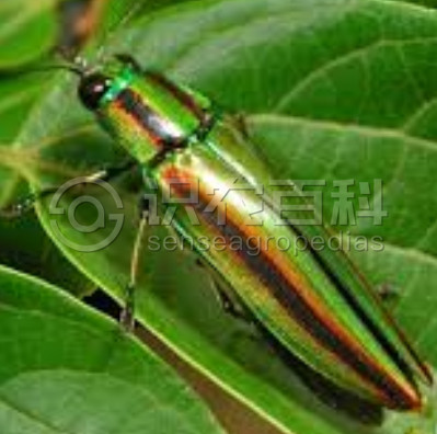 成虫:体长5.5-10毫米,全体紫铜色,有光泽。头部短而宽,前端呈截形,翅端尖削,体似楔状。 幼虫:体长15-22毫米,体扁平。头部和尾部为褐色,胸腹部乳白色。头大,大部入前胸。前胸特别宽大,中胸特小。腹部第七节最宽,胸足、腹足均已退化。 卵:长约1毫米,椭圆形,初产时乳白色,后逐渐变成黄褐色。卵产在枝条向阳面、粗糙有裂纹处
