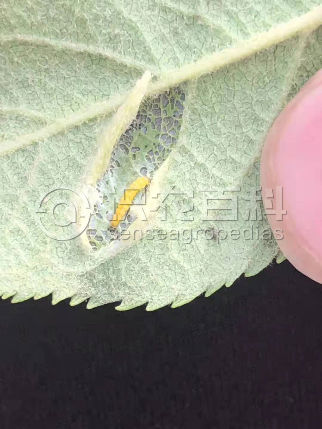 属鳞翅目,细蛾科。主要为害苹果,也为害沙果、海棠、山定子、山楂、梨、桃等。以幼虫潜食叶肉,形成虫斑,当一片叶有多个虫斑时,便可引起叶片脱落。所以,该虫发生严重时,可降低叶片光合作用,导致叶片提早脱落,阻碍树体和果实生长,甚至出现第二次开花。