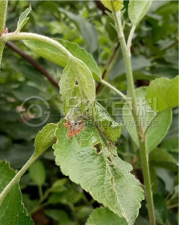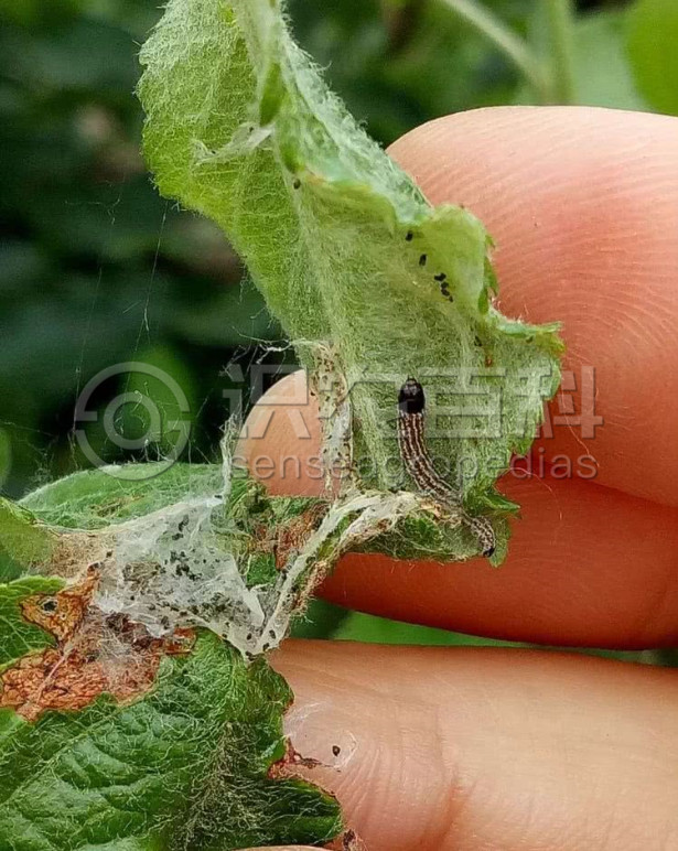 黑星麦蛾又名苹果黑星麦蛾、黑星卷叶芽蛾、黯星卷叶蛾,属鳞翅目,麦蛾科。以幼虫卷叶为害,幼虫在新梢上吐丝结叶片作巢,内有白色细长丝质通道,并夹有黑色虫粪,虫苞松散。严重时全树枝梢叶片受害,只剩叶脉和表皮,造成二次发芽,影响果树生长发育和次年开花结果。
