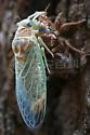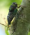 (1)成虫:体长40~48mm,全体黑色,有光泽。头部前缘及额顶各有黄色一块,中胸背面宽大,中央高突,有“X”形突起。前后翅透明,基部翅脉金黄色。仅雄虫有鸣器,雌虫产卵器明显。