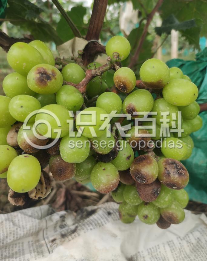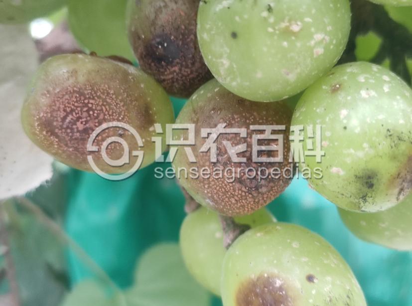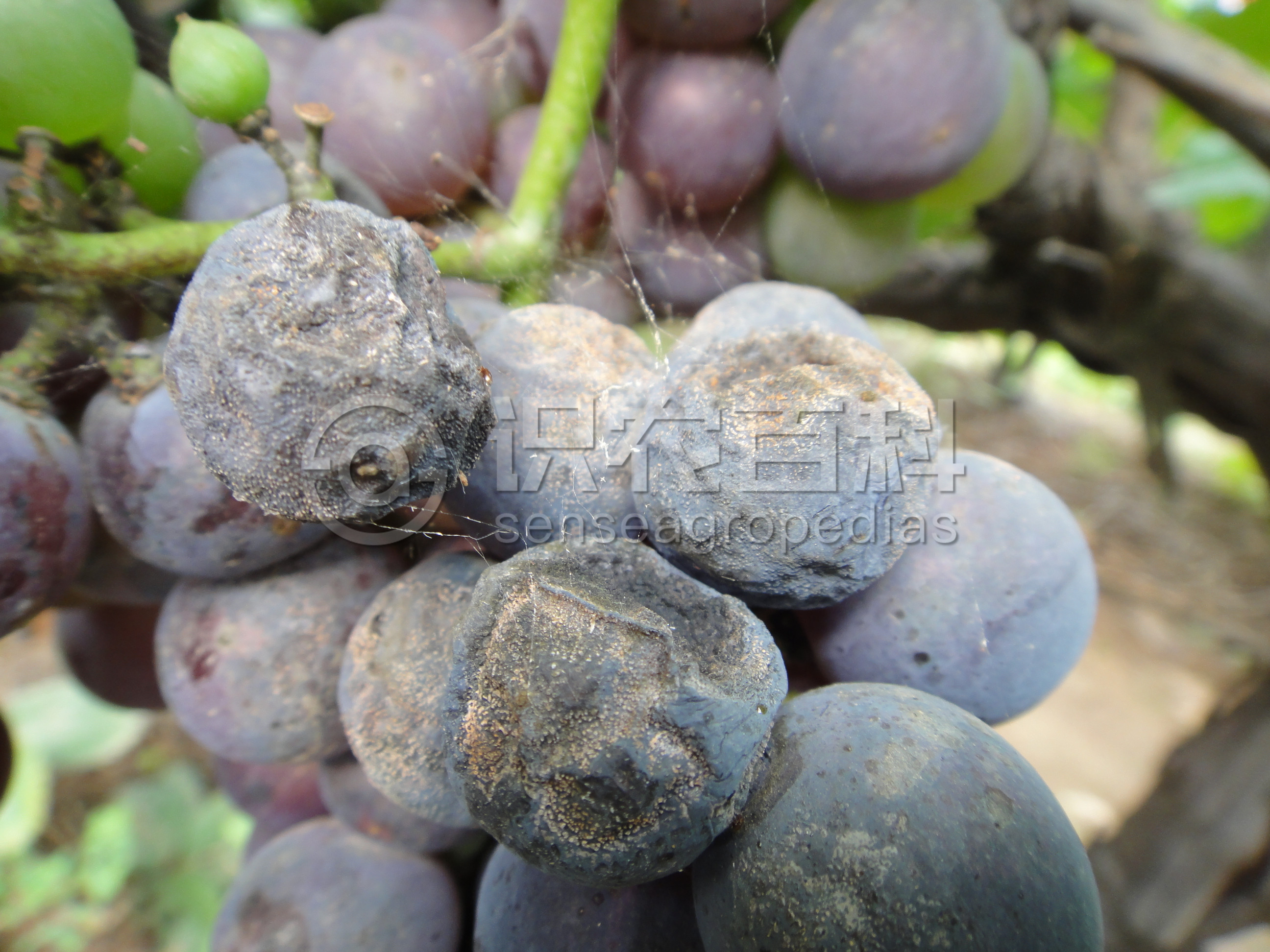 主要危害着色或近成熟的果粒,造成果粒腐烂;着色后的果粒发病,初期在果面上产生针头大小的淡褐色斑点或雪花状斑纹,其后病斑逐渐扩大,呈凹陷的深褐色圆形病斑,其上密生轮纹状小黑点;天气潮湿时,溢出粉红色黏液。发病严重时,病斑可以扩展到半个或整个果而,果粒软腐,易脱落,病果酸而苦。