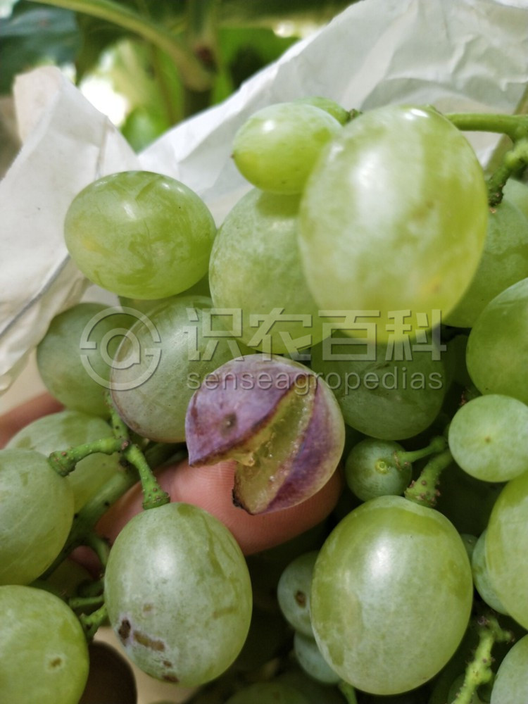 (1)寄主抗病性:如藤稔、乍娜、凤凰51,里扎马特、黑大粒、红富士、白羽葡萄果皮太薄,不坚固,极易裂果;布朗无核等品种的果皮与果肉紧贴在一起,不易剥离,果肉细胞增大后,往往使部分果皮受压紧绷,引起裂果;康太等品种果穗太紧,果肉细胞膨压增大后粒间挤压易引起裂果。