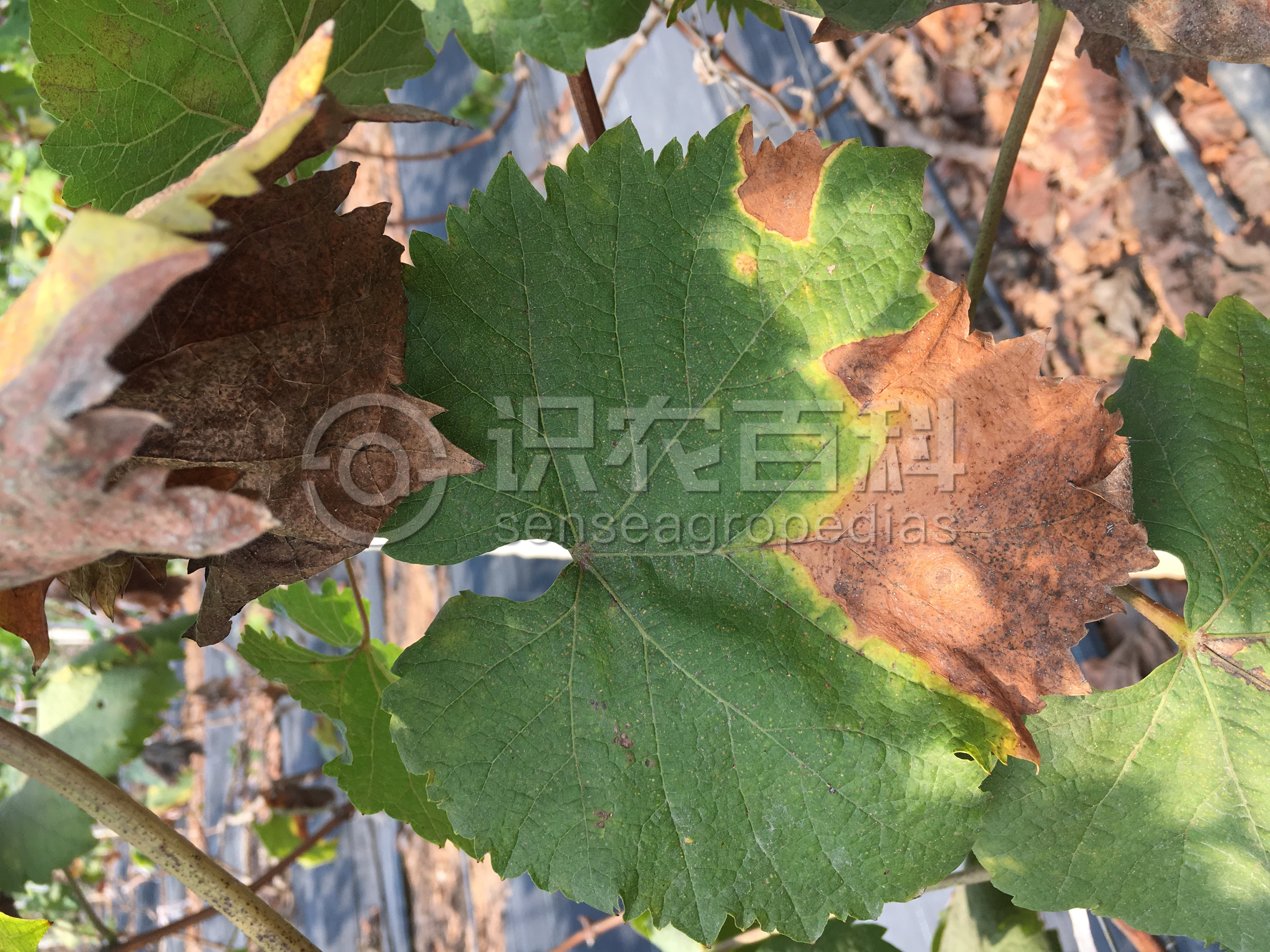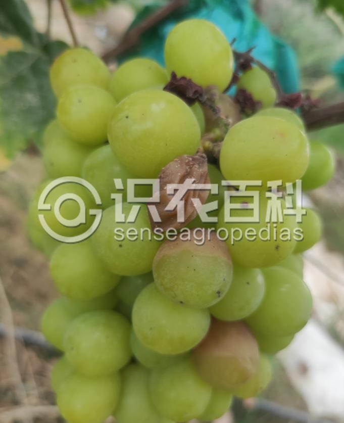 叶片:多在叶缘或破损处发生,形成深浅不同的同心轮纹,干枯后病斑极易破碎。果实:接近地面的果穗尖端,初发病,产生水浸状、淡褐色、不规则的病斑,呈腐烂状,发病1周后,果面密生一层灰白色的小粒点,病部渐渐失水干缩并向果粒蔓延,果蒂部分先变为淡褐色,后逐渐扩大呈软腐状,以后全粒变褐腐烂。