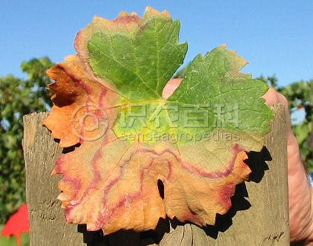叶片:生长中期,叶片出现局部灼烧状病变,沿着叶脉发生,包围1个主脉,灼烧后逐渐转成褐色,像烧焦一样。根据品种的不同,病区边缘转成黄色或微带红色。