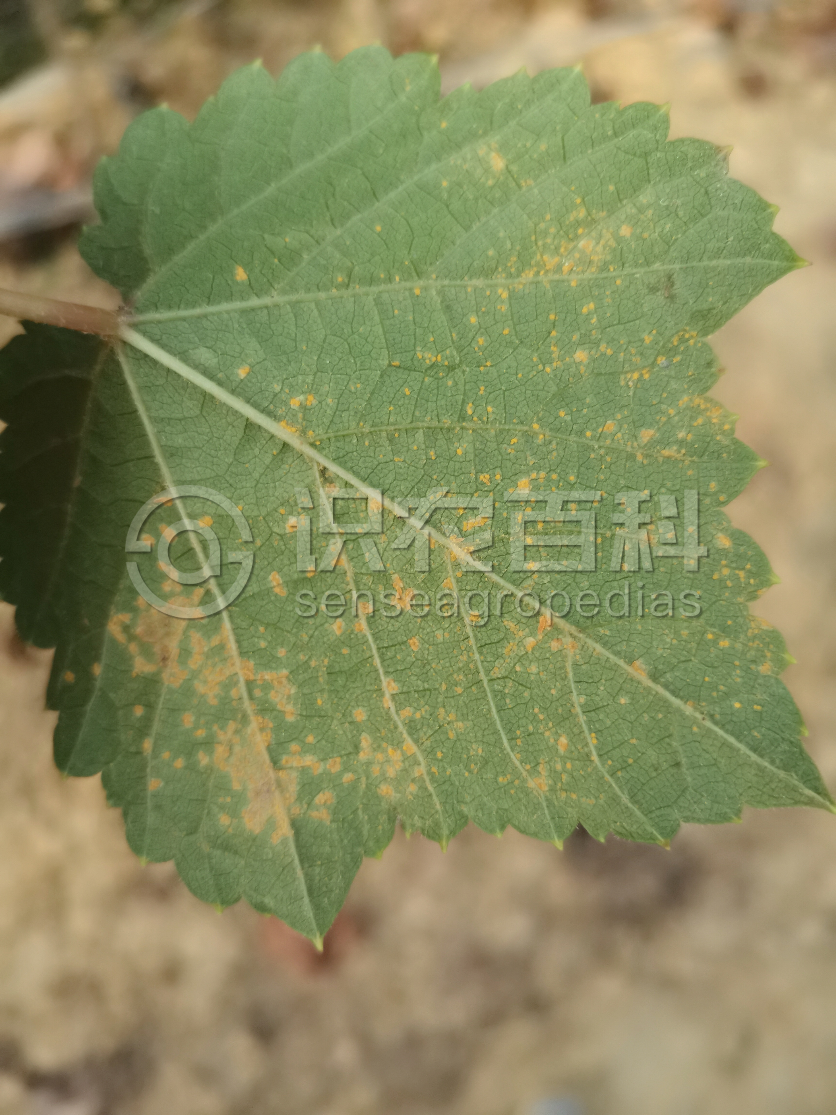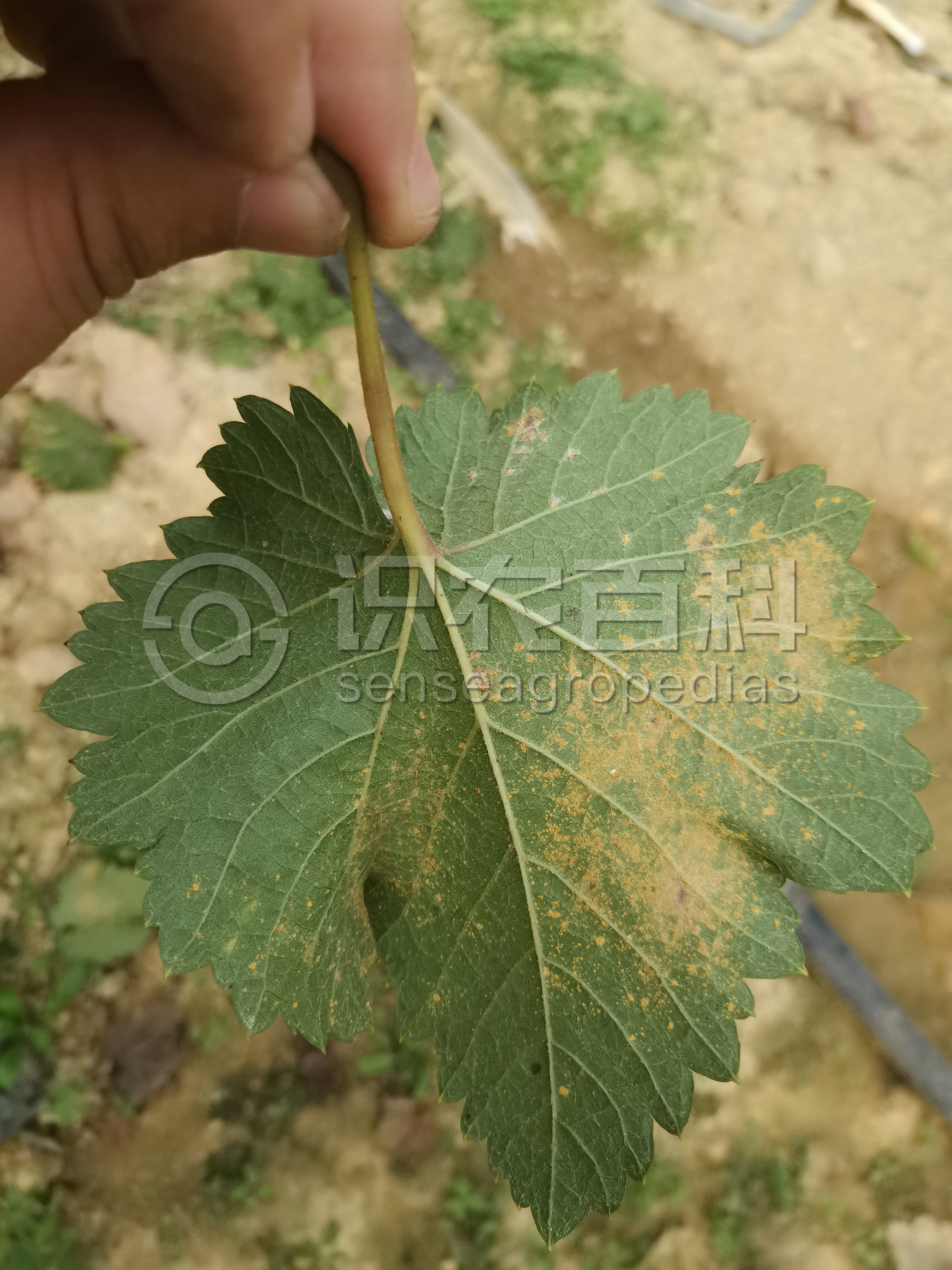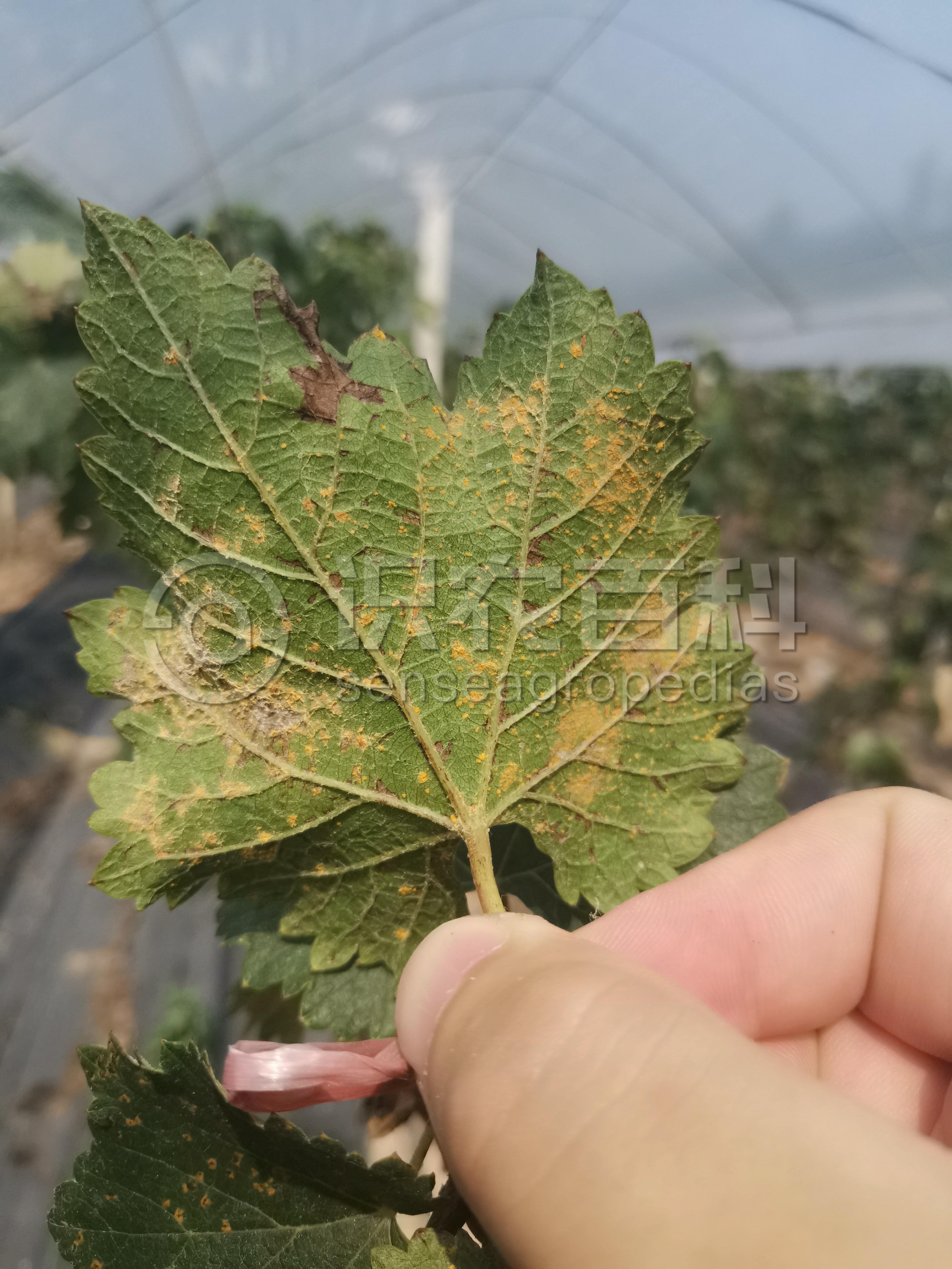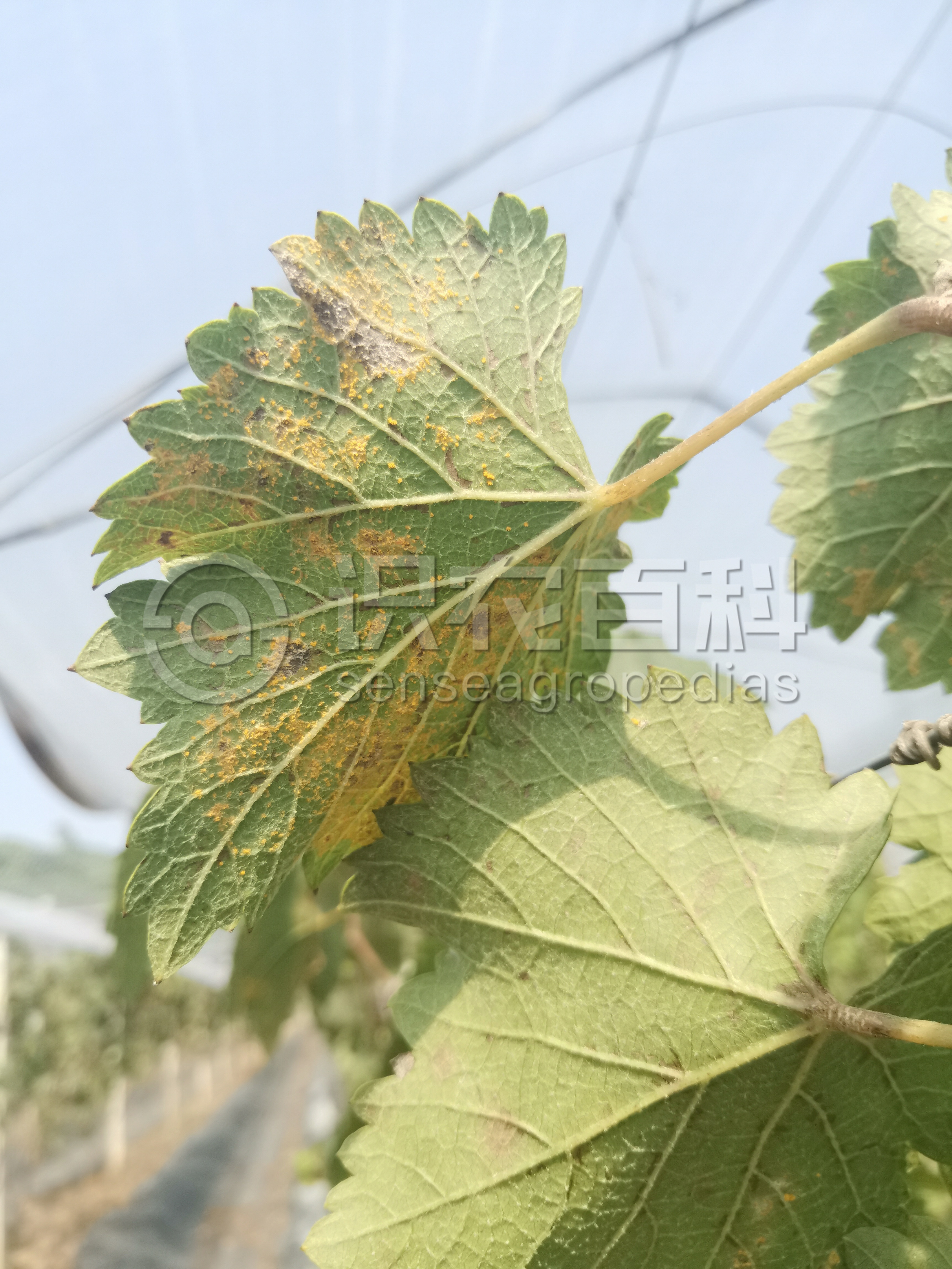 葡萄锈病主要为害植株中下部叶片。病初叶面现零星单个小黄点,周围水浸状,后病叶背面形成枯黄色夏孢子堆,逐渐扩大,沿叶脉处较多。夏孢子堆成熟后破裂,散出大量橙黄色粉末状夏孢子,布满整个叶片,致叶片干枯或早落。秋末病斑变为多角形灰黑色斑点形成冬孢子堆,表皮一般不破裂。偶见叶柄、嫩梢或穗轴上出现夏孢子堆。
