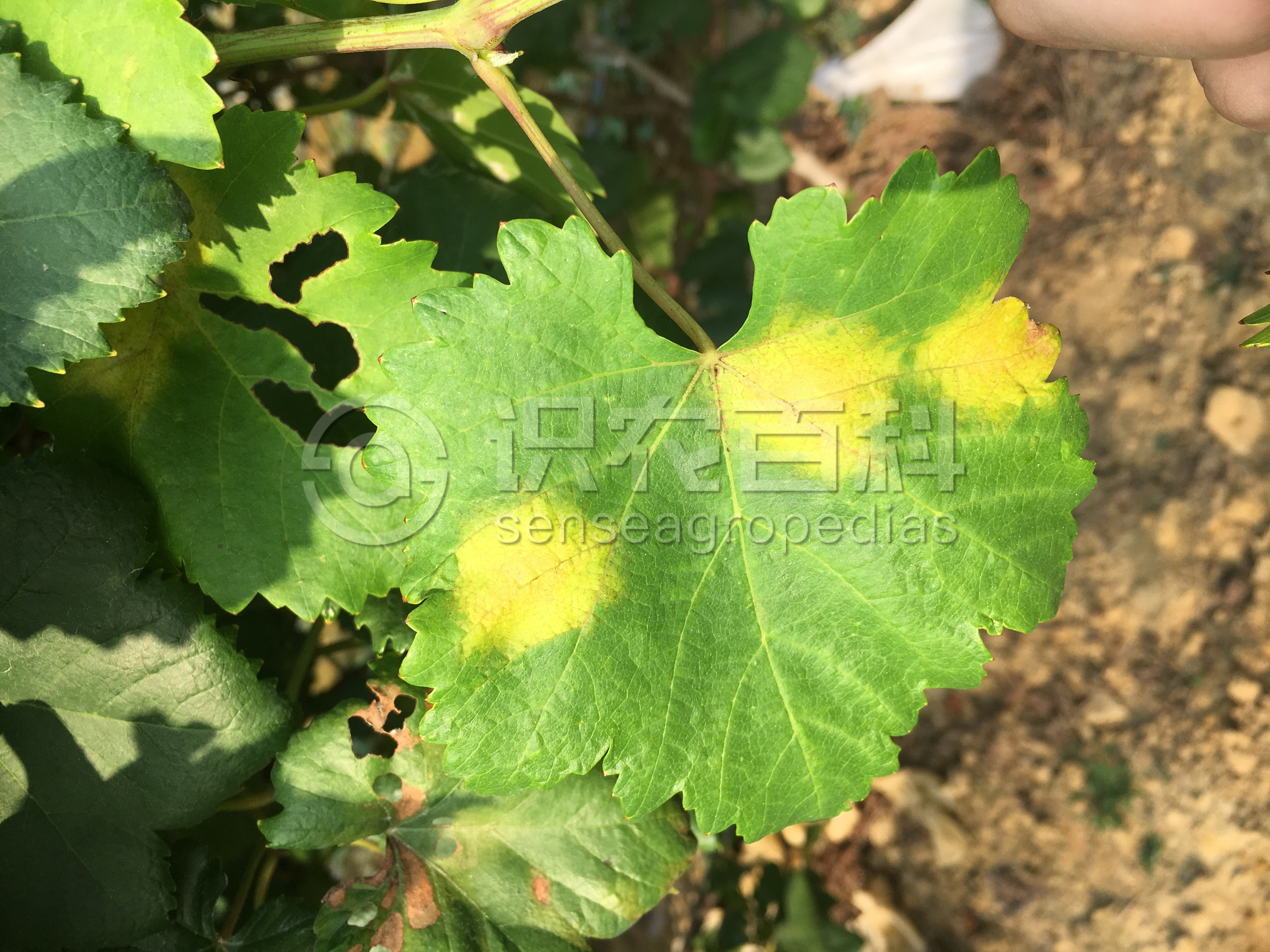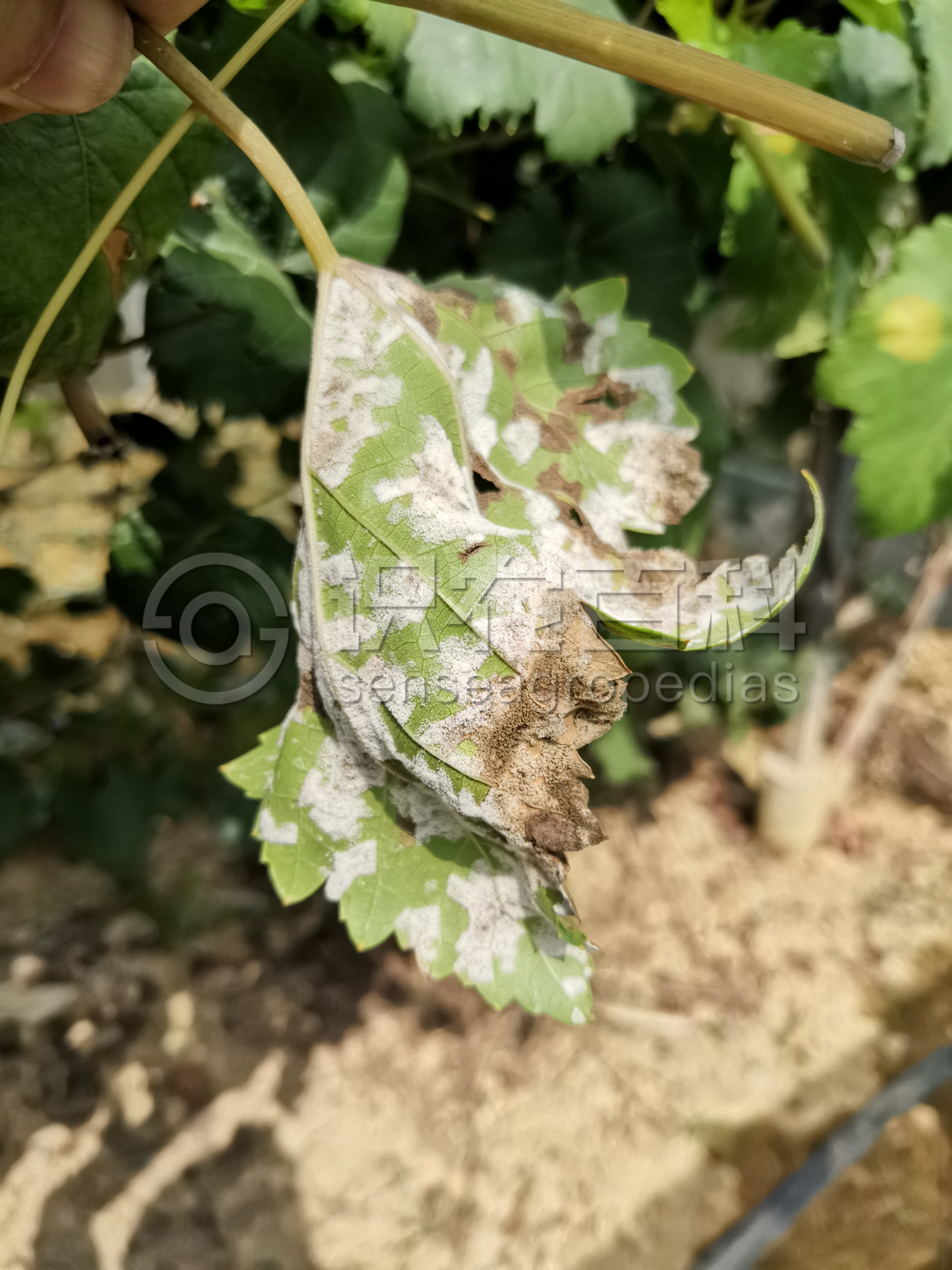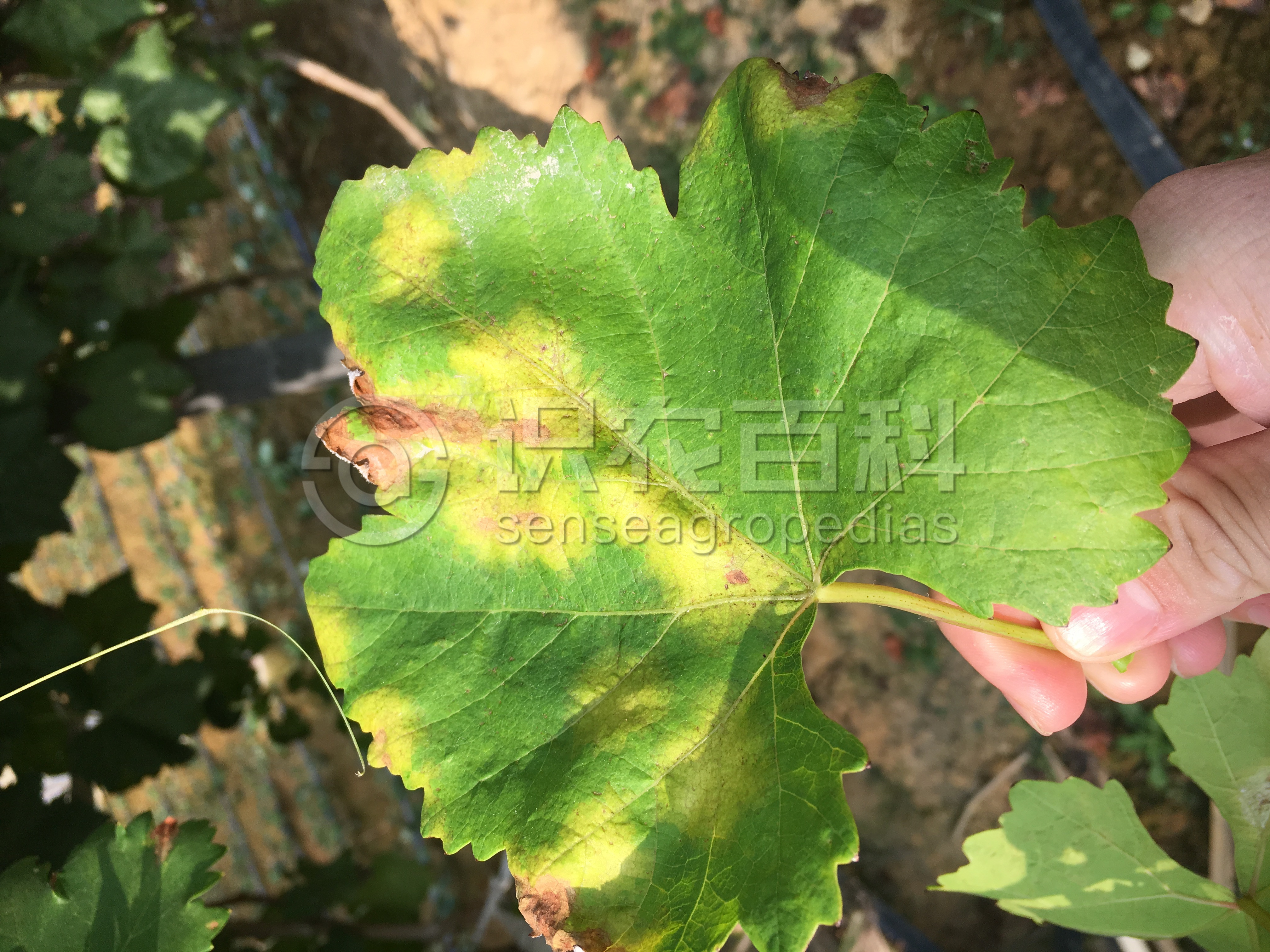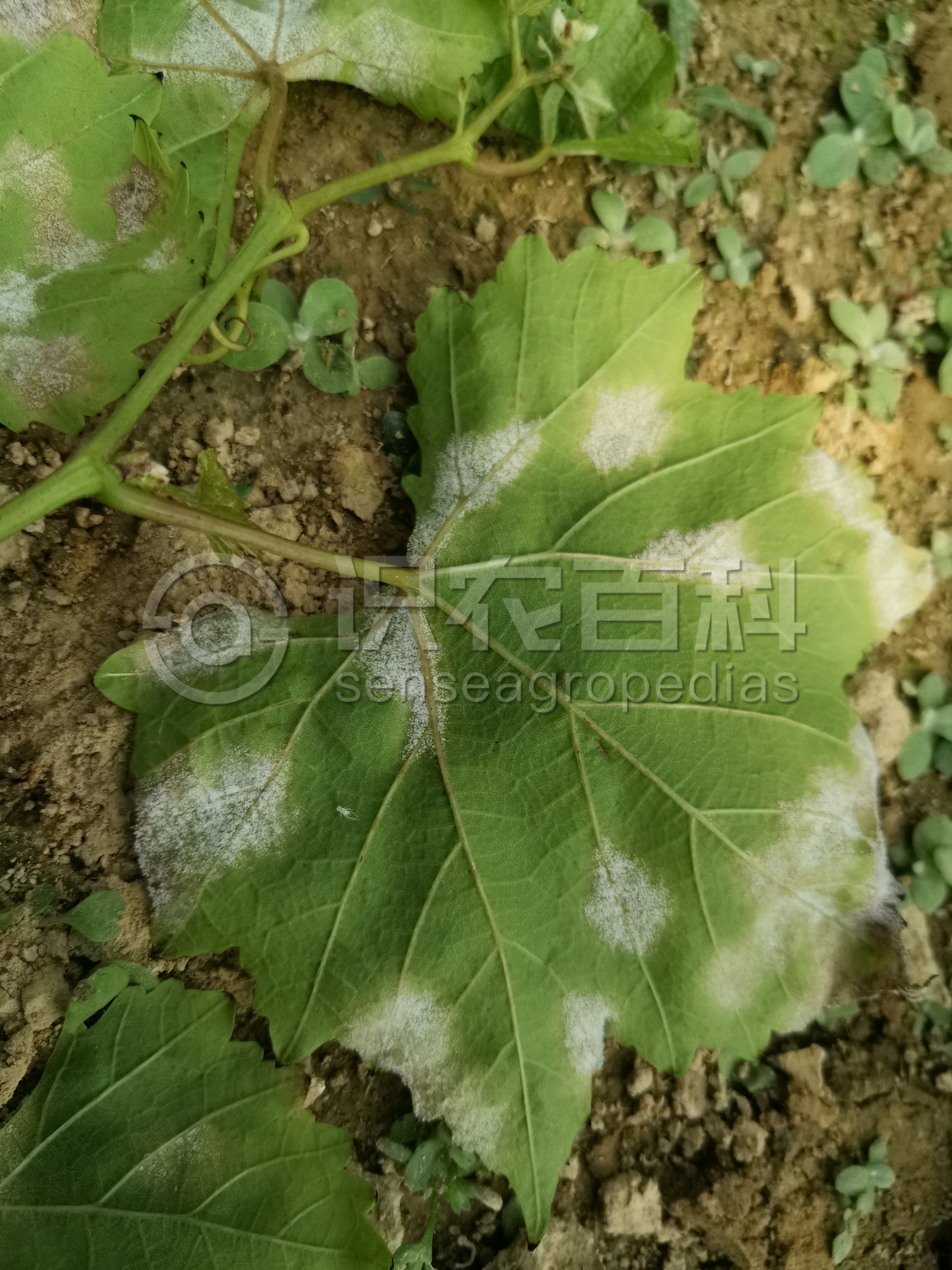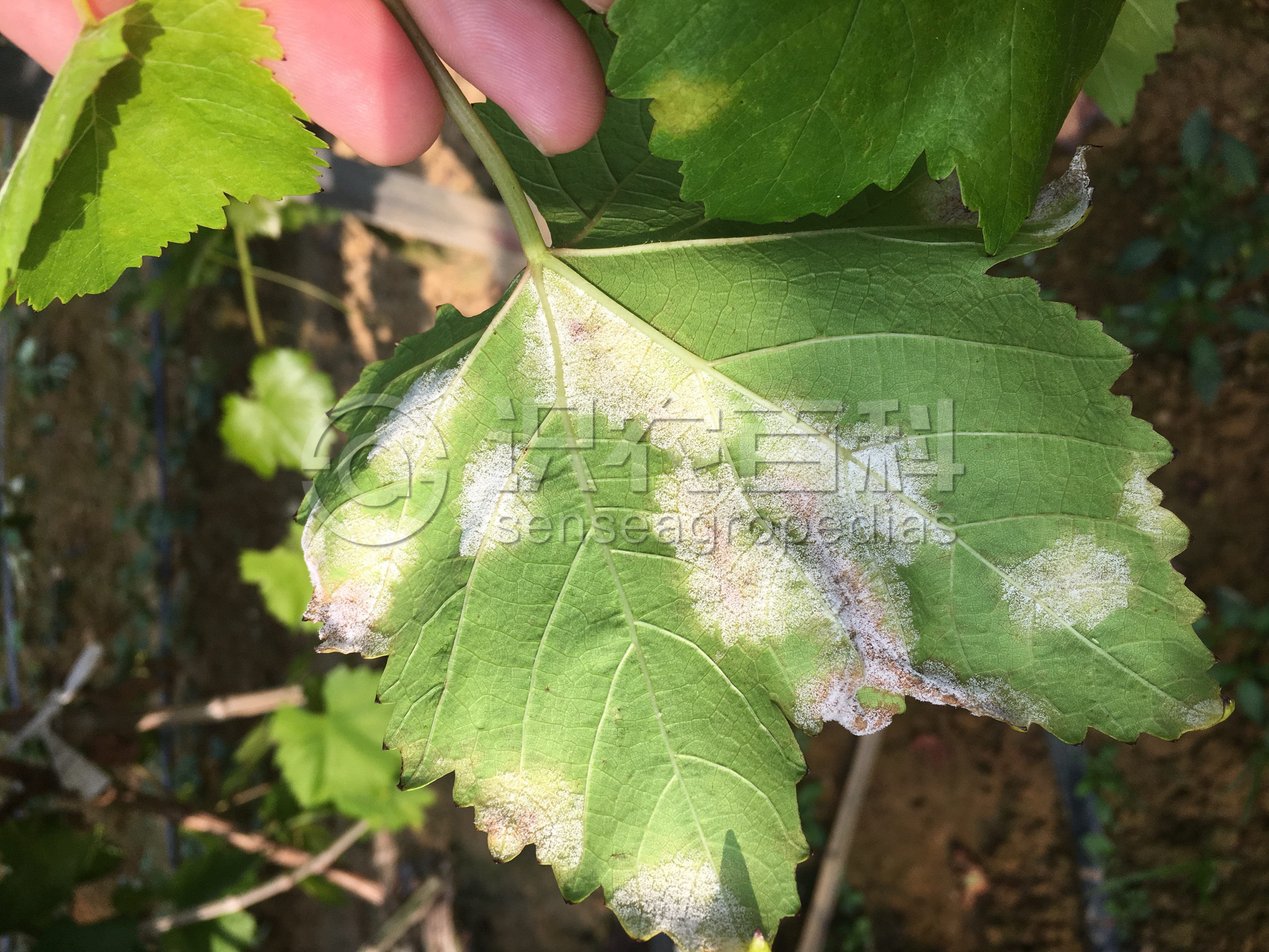 葡萄霜霉病只为害葡萄地上部幼嫩组织,如叶片、新梢、花穗和果实等。叶片:病部油浸状,半透明,角型,淡黄色至红褐色,限于叶脉,病斑大小因品种或发病条件而异。发病4~5天后,病斑部位反面形成幼嫩密集白色似霜物,这是本病的特征,霜霉病因此而得名。果实:幼嫩的果粒高度发病,感染后果色变灰色,表面满布霜霉。