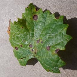 主要为害果实、叶片、叶柄和新梢等部位。该病症状与房枯病相似,房枯病主要为害果实,很少为害叶片。叶片:病斑多发生在叶缘处,初为红褐色近圆形小斑点,后扩大成边缘为黑色,中间为灰白或浅褐色的大斑。果实:首先是变浅褐色,软腐,出现圆形斑点,斑点迅速扩大,在2~3天内浆果全部褪色,腐烂的浆果不久萎缩,经7~10天变成黑色、坚硬、多皱的僵果。