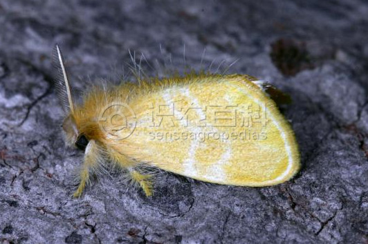 (1)成虫:体长9~12mm,雌蛾稍大,头、触角、胸以及前翅黄色。复眼圆,赤色。前胸背部和前翅内缘有黄色密生的细毛。触角羽状。前翅中央从前缘至内缘有2条白色横带。后翅内缘及基部密生有淡黄色的长毛,腹部末端有橙黄色的毛块。