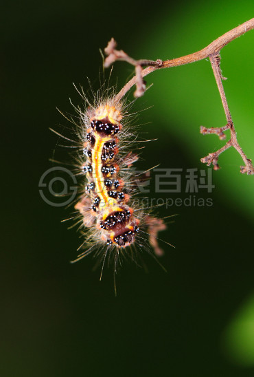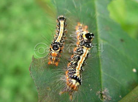 (3)幼虫:体长25mm,体橙黄色,头褐色,体节上有毒毛,背部中央生有赤色纵线。
