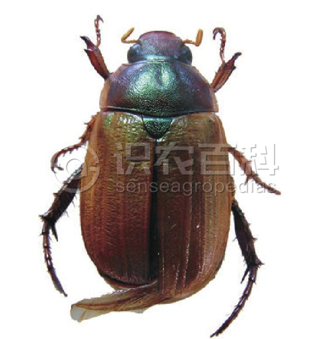 (1)成虫:小型甲虫,长椭圆形。体长7.5~12mm,宽4.5~6.5mm。中段宽,翅基最宽,前后收缩。体色深铜绿色,有光泽。鞘翅浅褐色或草黄色,四缘呈深褐或黑褐色,臀板基部有白色毛斑2个。腹部1~5腹板侧端毛多,而聚成白斑。触角棒状部3节组成,雄虫触角长大。前胸背板密布刻点,点间宽于点径,两侧刻点甚密,但几乎无相互融合者,侧缘后端近平行,前端明显向内收拢;前侧角锐而前伸,后缘角钝角形,后缘侧科斜边有边框,中段向前弧弯。小盾片三角形。鞘翅颇扁平,背面有6条近相平行的刻点沟,第2刻点沟刻点较散乱,后方不达翅端,沟间带微隆拱。臀板隆凸,密布锯齿形横纹。中胸腹突短阔、末端圆钝,侧视略见前冲。足较粗壮,前足胫节外缘两齿,中、后足胫节略呈纺锤形。