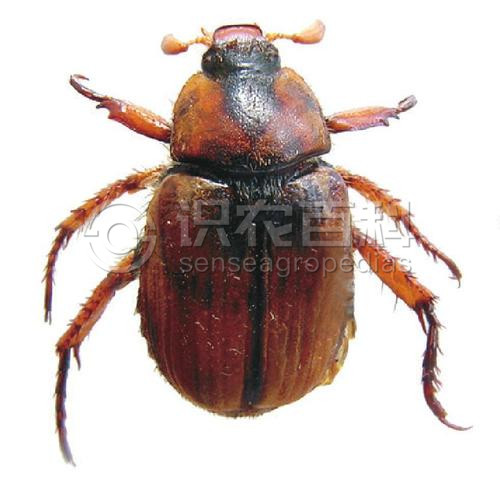 成虫可以取食多种植物,食叶成缺刻或孔洞,食量较大。幼虫为害苗木根部。