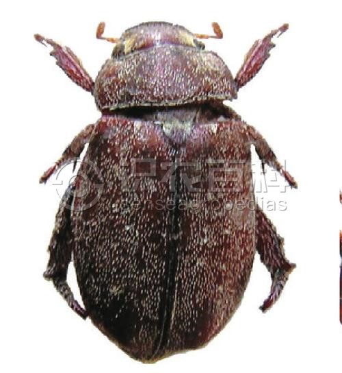 (1)成虫:成虫体长9.4~10.5mm,宽4.7~5.3mm。体褐色或棕褐,腹部色较深。全体密被乳白色披针形鳞片,光泽较暗淡。体狭长,椭圆形。头大,唇基近半圆形,前缘高高折翘,头顶隆拱,复眼圆大,上唇下缘中部呈“T”字形,延长似喙。触角10节,鳃片部3节。前胸背板甚短阔,前后缘近平行,侧缘弧形扩出,前侧角锐角形,后侧角钝角形。小盾片三角形。鞘翅有3条纵肋纹可辨,在纵肋纹Ⅰ、Ⅱ上常有3~4处鳞片密聚而呈白斑,端凸上鳞片常十分紧挨而成明显白斑,其外侧尚有1较小白斑。臀板短阔,呈三角形,端缘边框扩大成1个三角形裸片(雄)前胸腹板垂突尖而突出,侧面有一凹槽。后足胫节外缘有1小齿突。