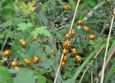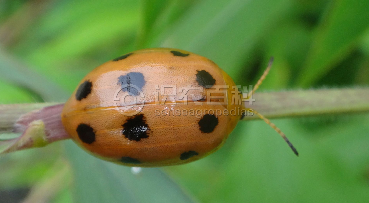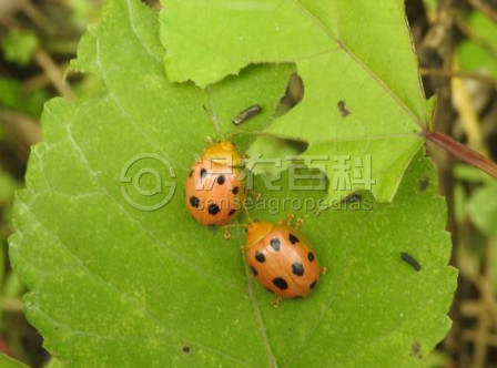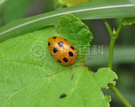 (1)成虫:体长12mm左右,宽8.5mm左右。体土黄色,椭圆形,似瓢虫。头小,常隐于前胸下。触角淡黄色,末端4或5节为黑褐色。前胸背板有许多小刻点。两鞘翅上共有黑色圆形斑点10个,但常有变化。足淡黄色,前足小,中、后足大。后胸及第1~4腹节的腹板两侧各具近圆形黑点1个。