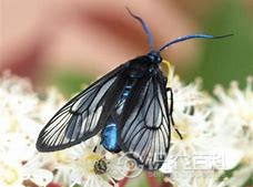 (1)成虫:体长9~13mm,翅展27~28mm。体及翅黑色,翅半透明,翅脉和翅缘黑色。触角、胸背及前翅略有蓝色闪光,后翅前缘暗黑。雄性触角双栉齿状,雌性触角单栉齿状。