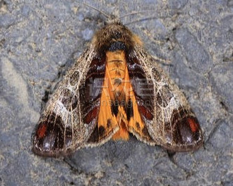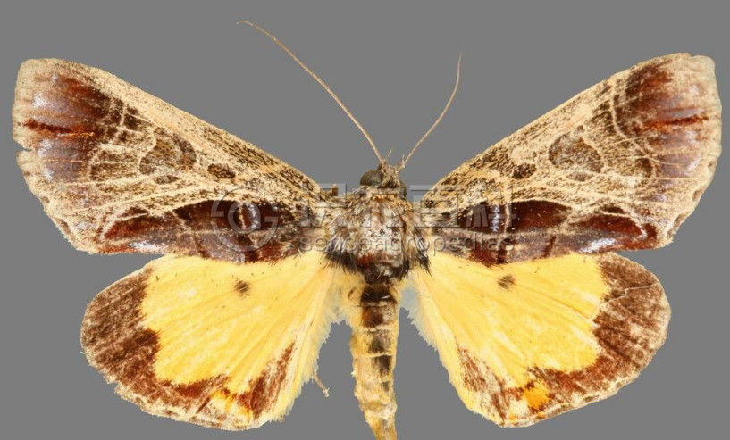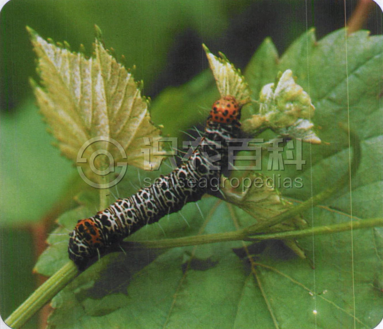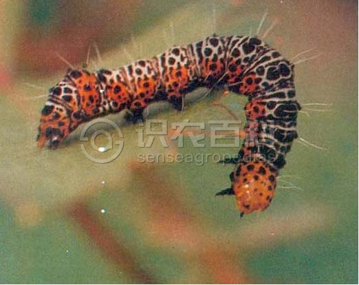 (2)幼虫:前端较细后端较粗,第8腹节稍有隆起。头部橘黄色,有黑色毛片形成的黑斑,体黄色,散生不规则的褐斑,毛突褐色。