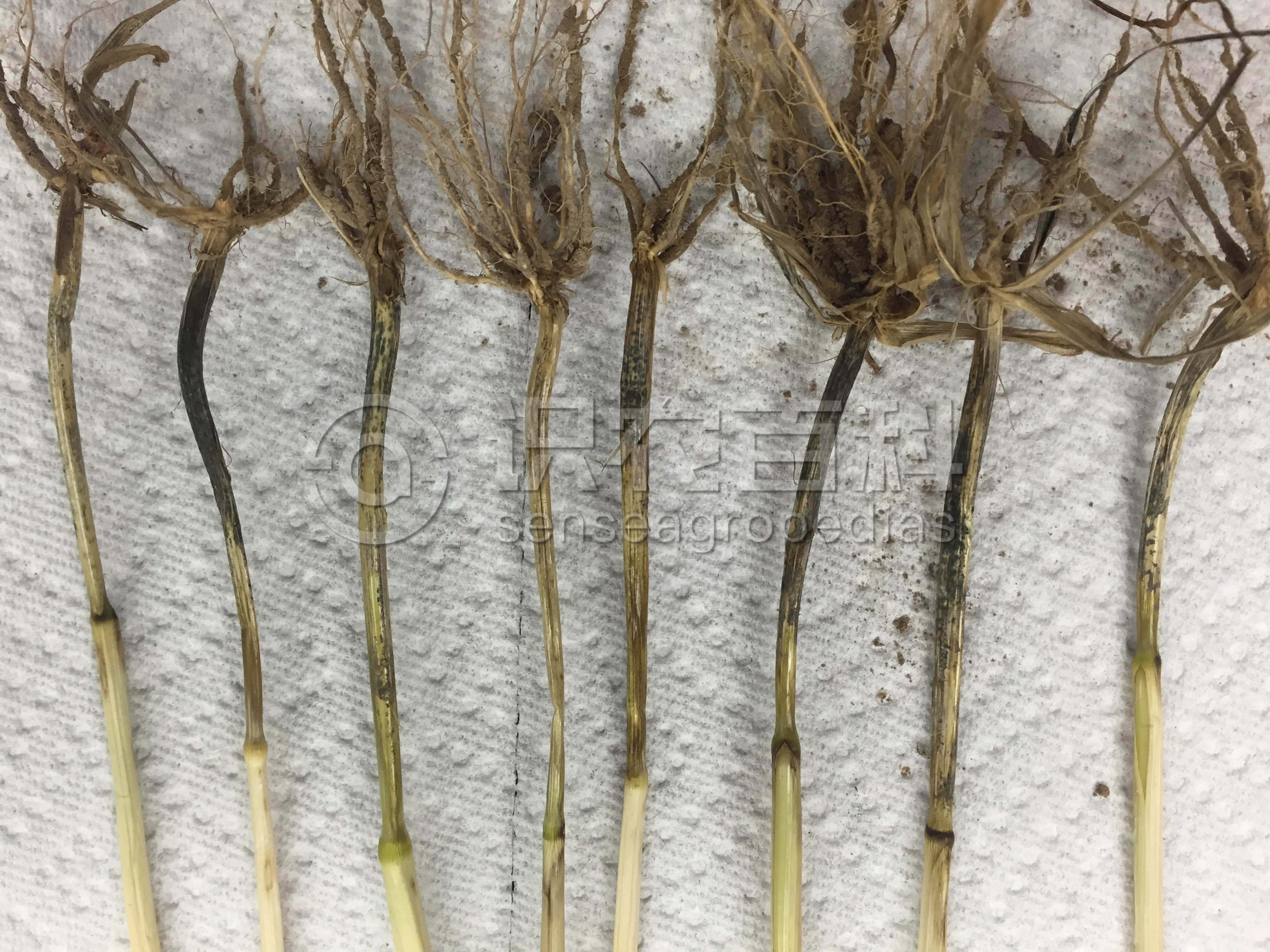 小麦全蚀病是一种根腐和基腐性病害,在小麦全生育期均可发病,病菌只侵染根部和茎基部1-2节。幼苗发病后,植株矮化,下位黄叶多,分蘖减少,类似干早缺肥状,初生根(种子根)和根茎(地中茎)变成黑褐色,严重时可造成全株连片枯死。“全蚀”这个名词就是用来形容苗期被害严重时的状态。节期冬麦病苗返青迟缓、分集少,病株根部大部分变黑,在茎基部及叶鞘内侧出现较明显灰黑色菌丝层。抽穗后病株成簇或点片状发生早枯白穗,病根变黑,易于拔起。在茎基部及叶鞘内布满黑褐色菌丝层,星“黑脚”状,后颜色加深呈“黑膏药”状,其上密布黑色颗粒状子囊売。土壤干早时,“黑脚”及“黑膏药”特征不明显,也不形成子囊壳,但茎基和根变成黑褐色,出现白穗。“黑脚”和“白穗”是成株期所特有的症状。