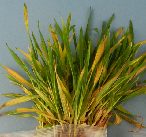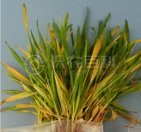 小麦幼苗染病后冬前不表现症状,到春季小麦返青期出现症状,染病株新叶上产生褪绿条纹,少数心叶扭曲畸形,以后褪绿条纹增加并扩展,病斑联合成长短不等、宽窄不一的不规则条斑,形似梭状,病株叶脉初为绿色,后全叶变成橘黄色,老病叶渐变黄、枯死。病株匍匐状,分蘖少、萎缩,根系发育不良,重病株明显矮化,拔节抽穗少,麦穗小。