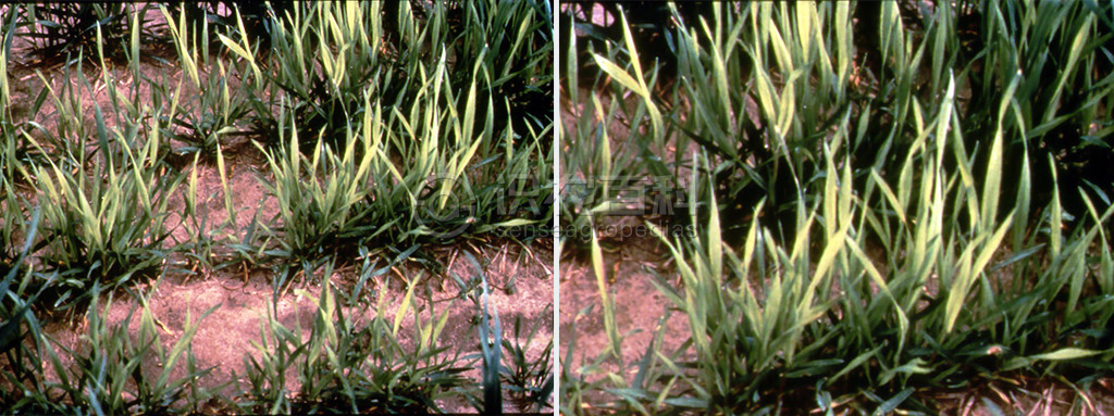 色淡绿,幼叶失绿较下部叶片明显,严重缺乏时叶片出现褐色斑点;植株矮小,叶细小,叶片向上卷曲,变硬易碎。黄化叶与缺氮症状相类似,但发生症状的部位不同,上位叶黄化为缺硫,下位叶黄化为缺氮;上位叶黄化症状与缺铁相似,缺铁脉间失绿,缺硫叶脉失绿。