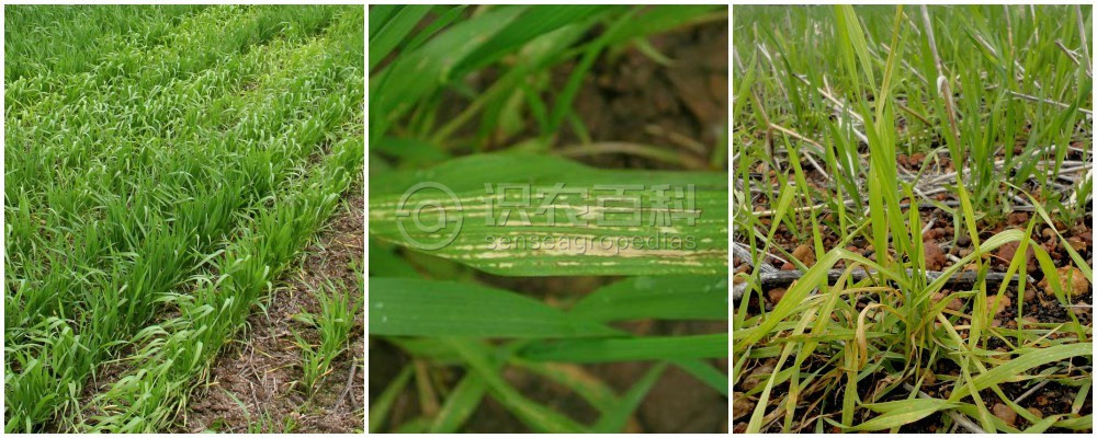 黄苗,主要表现为叶片柔软下披,新叶脉间条纹状失绿,由绿黄到黄色,叶脉仍为绿色;有时叶片呈浅绿色,黄色的条纹扩大成褐色的斑点,叶尖出现焦枯。小麦前期失绿与缺镁相似,缺镁失绿先从基部叶开始,缺锰则从中上部叶开始,出现的斑点细小。