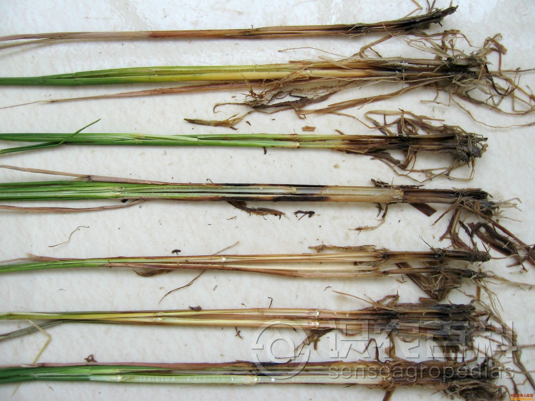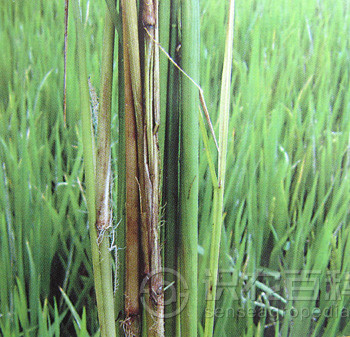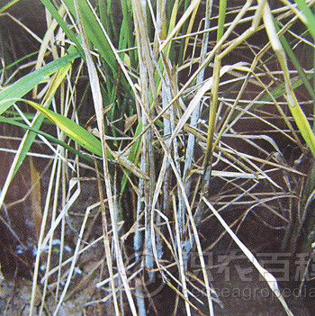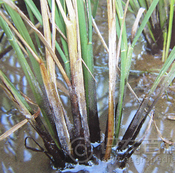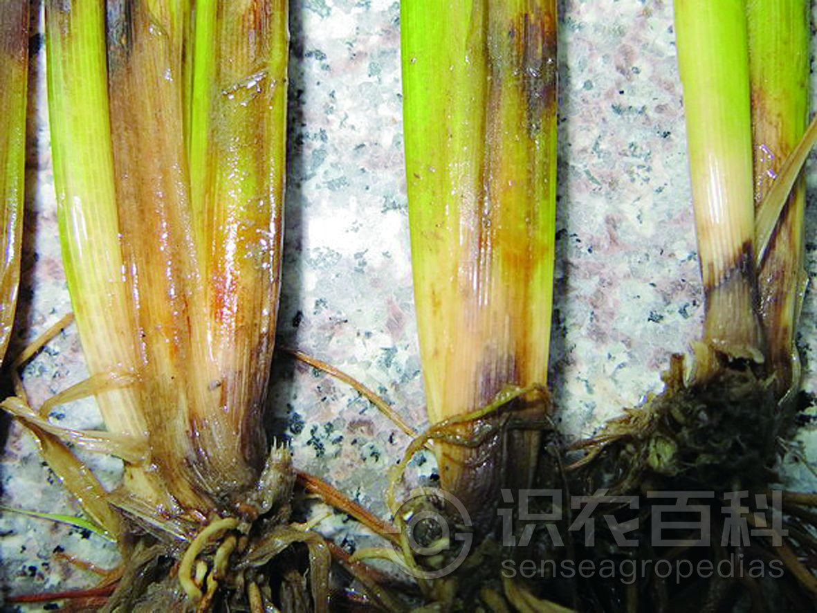 主要为害根节部和茎基部。分蘖期发病常在近土表茎基部叶鞘上产生水浸状椭圆形斑,渐扩展为边缘褐色、中间枯白的不规则形大斑,剥去叶鞘可见根节部变黑褐,有时可见深褐色纵条,根节腐烂,伴有恶臭,植株心叶青枯变黄。拔节期发病叶片自下而上变黄,近水面叶鞘边缘褐色,中间灰色长条形斑,根节变色伴有恶臭。穗期发病病株先失水青枯,后形成枯孕穗、白穗或半白穗 ,根节变色有短而少的侧生根,有恶臭味。