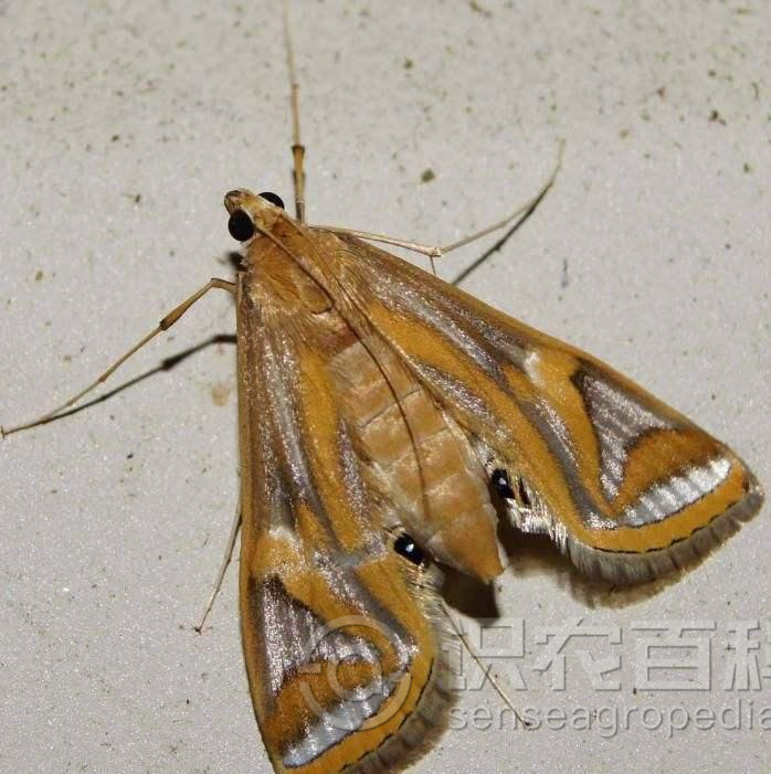 成虫体长6-9mm,翅展15-22mm,头前部和两复眼前白色。末龄幼虫体长13mm左右,黄白灰色,光滑无毛,两端色较深,头浅黄色,前胸背板浅褐色,具赤褐色斑点。蛹浅黄色,腹部2-4节气孔片突出,赤褐色。