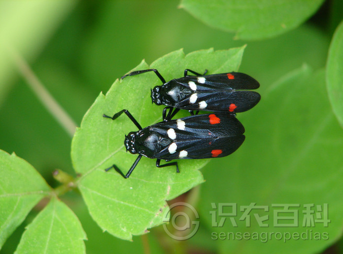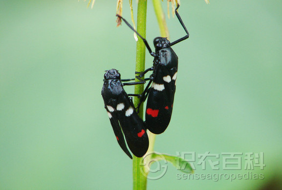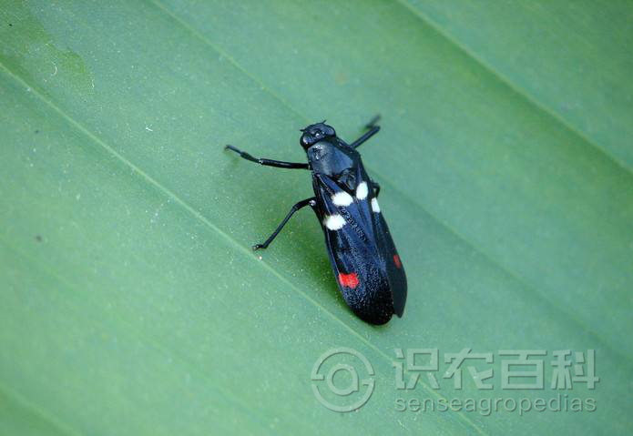 成虫体长11-13.5mm,黑色狭长,有光泽,前翅合拢时两侧近平行。头冠稍凸,复眼黑褐色,单眼黄红色。小盾片三角形,顶具1大的梭形凹陷。前翅黑色,近基部具大白斑2个,雄性近端部具肾状大红斑1个,雌性具2个一大一小的红斑。卵长椭圆形,乳白色。若虫共5龄,形状似成虫,初乳白色,后变浅黑色,体表四周具孢沫状液。