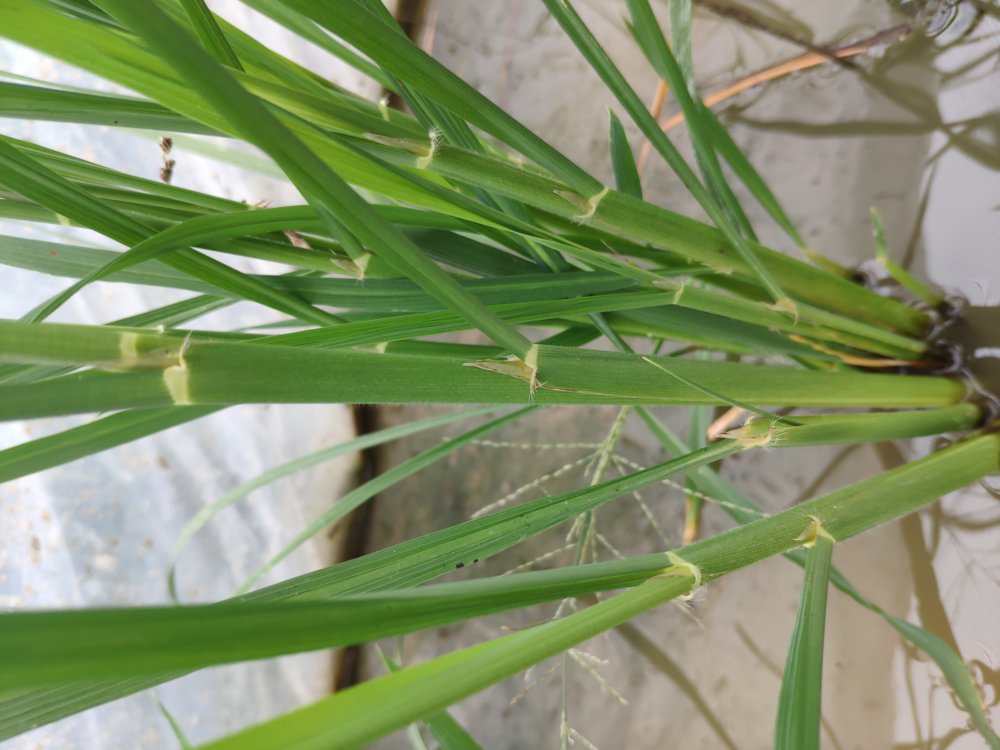 一年生水生草本。秆直立,高0.5-1.5米,随品种而异。叶鞘松弛,无毛;叶舌披针形,长10-25厘米,两侧基部下延长成叶鞘边缘,具2枚镰形抱茎的叶耳;叶片线状披针形,长40厘米左右,宽约1厘米,无毛,粗糙。圆锥花序大型疏展,长约30厘米,分枝多,棱粗糙,成熟期向下弯垂;小穗含1成熟花,两侧甚压扁,长圆状卵形至椭圆形,长约10毫米,宽2-4毫米;颖极小,仅在小穗柄先端留下半月形的痕迹,退化外稃2枚,锥刺状,长2-4毫米;两侧孕性花外稃质厚,具5脉,中脉成脊,表面有方格状小乳状突起,厚纸质,遍布细毛端毛较密,有芒或无芒;内稃与外稃同质,具3脉,先端尖而无喙;雄蕊6枚,花药长2-3毫米。颖果长约5毫米,宽约2毫米,厚约1-1.5毫米;胚比小,约为颖果长的1/4。染色体2n=24。