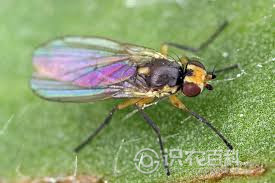 成虫体长2mm,黄褐色。头部黄色,间额褐色,单眼三角区黑色,复眼黑褐色,具蓝色荧光。触角黄色,触角芒不具毛。胸部黄色,背面具一'凸'字形黑斑块,前方与颈部相连,后方至中胸后盾片中部,黑斑中央具'v'字形浅洼;小盾片黄色,后盾片黑褐色。翅透明浅黑褐色。平衡棍浅黄色。各足腿节黄色。腹部5节,背板侧缘、后缘黄色,中部灰褐色生黑色毛;产卵器圆筒形黑色。幼虫体长2.5-3.0mm,乳白色,蛆状,前气门1对,黑色;后气门1对黑褐色,各具1短柄,分开向后突出。 腹部端节下方具1对肉质突起,腹部各节间散布细密的微刺。蛹长2mm,浅褐色,体扁,前后气门可见。