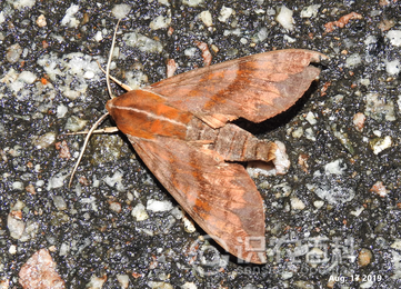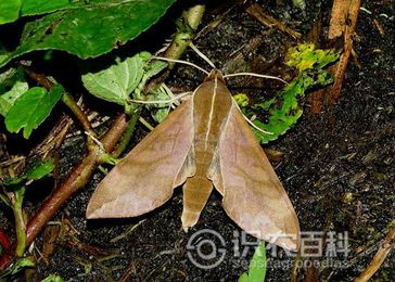 (1)成虫。体长约45mm,翅展90mm左右,体肥硕纺缍形,茶褐色。体背中央从前胸至腹端有1条灰白色纵线,复眼后至前翅基有1条较宽白色纵线。前翅各横线均暗茶褐色,前缘近顶角处有一暗色近三角形斑。