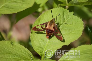 黑边天蛾成虫体长23-27mm,翅展41-54 mm。头部黄绿色;触角棒状,蓝黑色有金属光泽;前、中、后胸背板至腹部1-3节被黄绿色鳞毛。腹面黑色有棕色鳞毛,腹面尾毛棕色。前翅及后翅透明,翅框内缘有锯齿纹,各翅脉褐色。