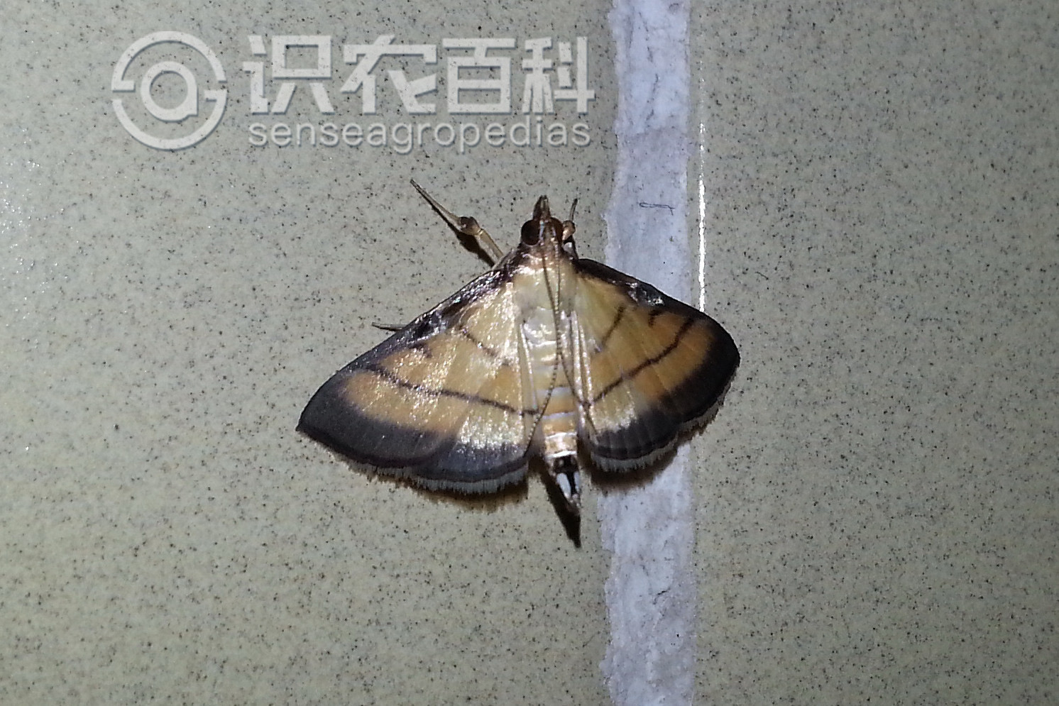(1)成虫:雌成蛾体、翅黄溜色,前翅前缘暗褐色,外缘具暗褐色宽带。雄蛾体稍小,色泽较鲜艳,前、后翅斑纹与雌蛾相近,但前翅前缘中央具1黑色眼状纹。