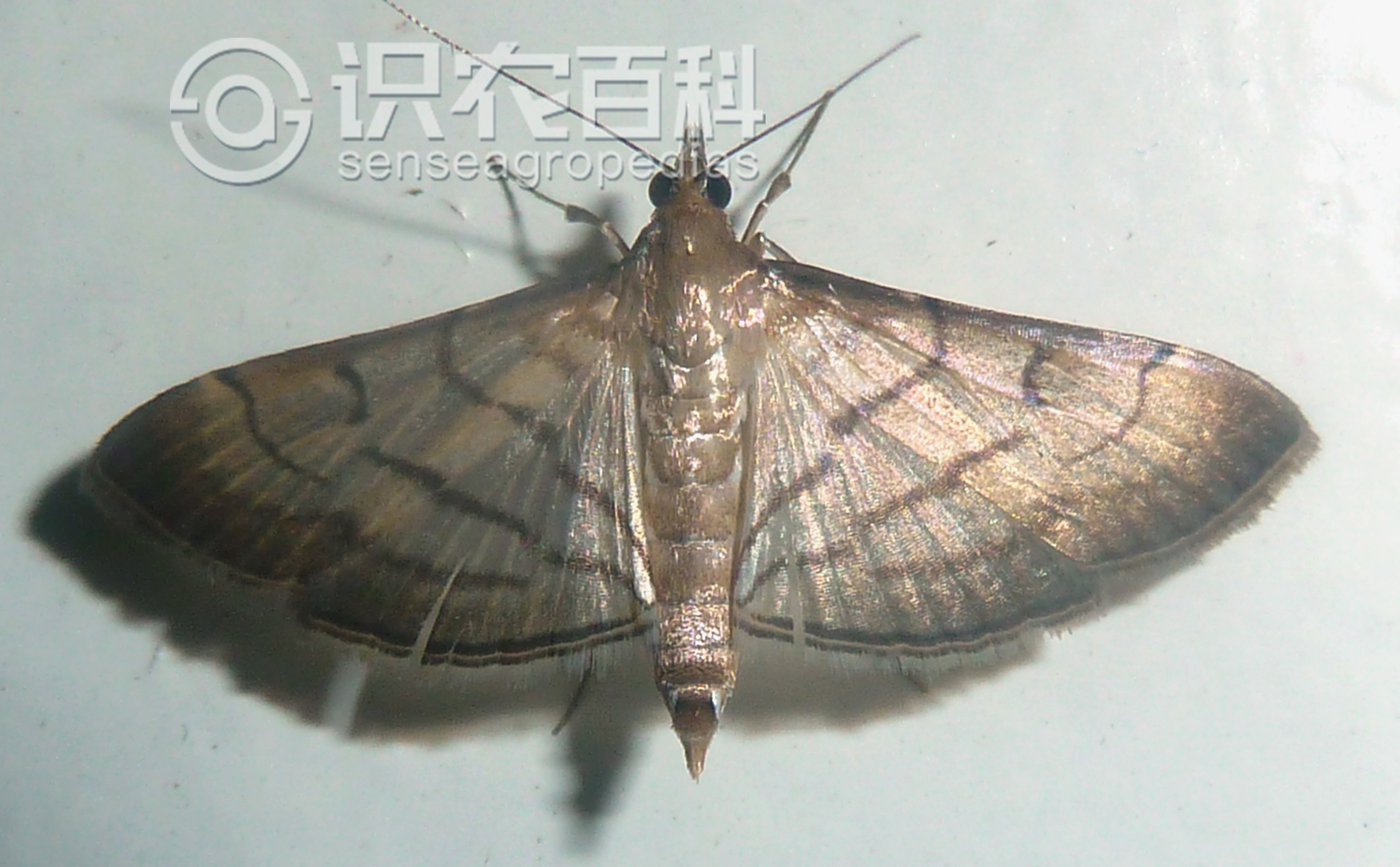稻纵卷叶螟:(1)成虫雌成蛾体、翅黄溜色,前翅前缘暗褐色,外缘具暗褐色宽带。雄蛾体稍小,色泽较鲜艳,前、后翅斑纹与雌蛾相近,但前翅前缘中央具1黑色眼状纹。