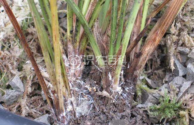 主要为害晚稻秧苗或成株的茎基部,病部呈褐色,表面产生白色绢丝状菌丝体,后期形成很多黄褐色小菌核。晚稻秧苗染病,引致苗枯。成株染病,病株叶片变黄,整株枯萎。