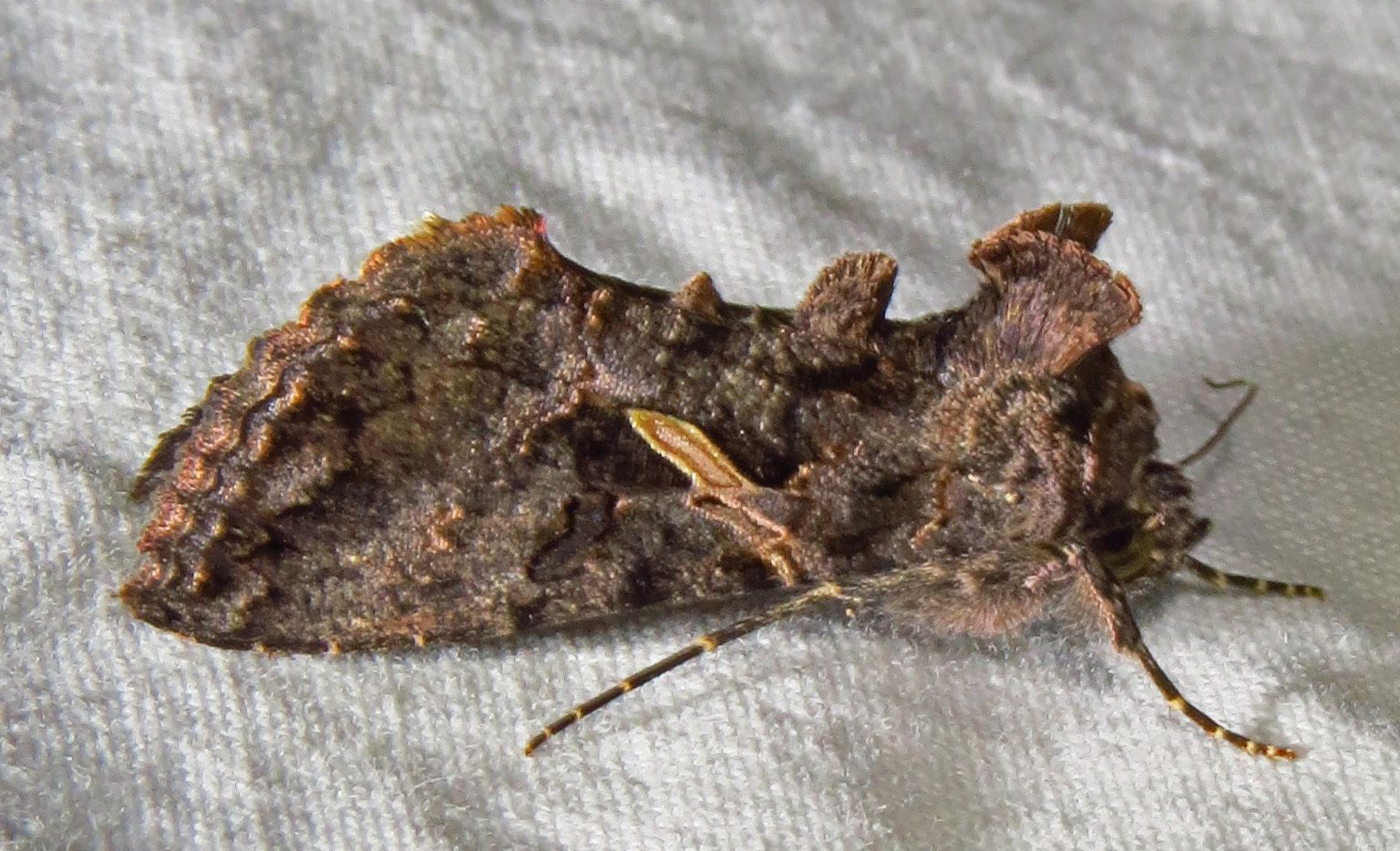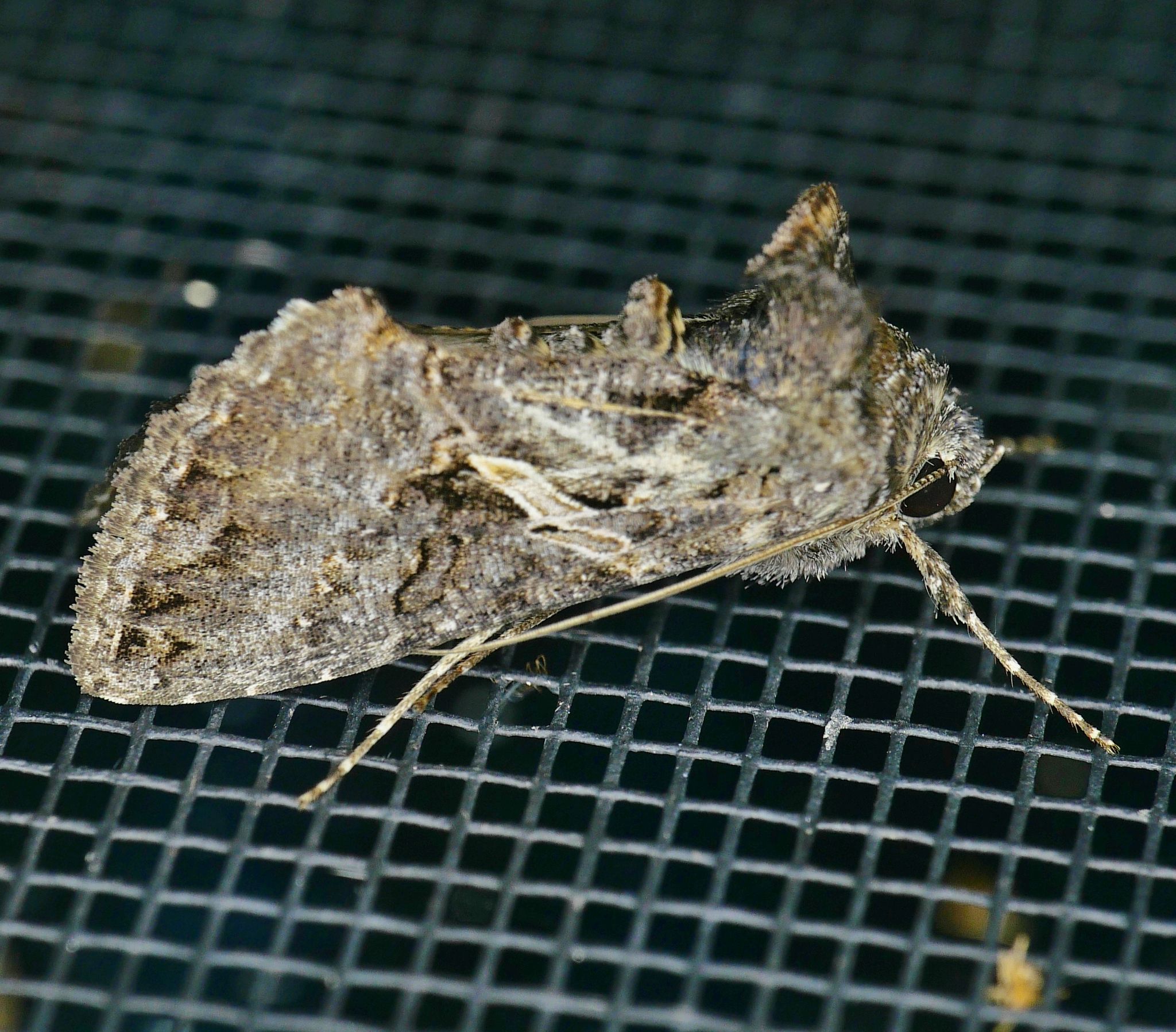 体长12-17mm,翅展32mm,体灰褐色。前翅深褐色,具2条银色横纹,翅中有一显著的U形银纹和一个近三角形银斑;后翅暗褐色,有金属光泽。