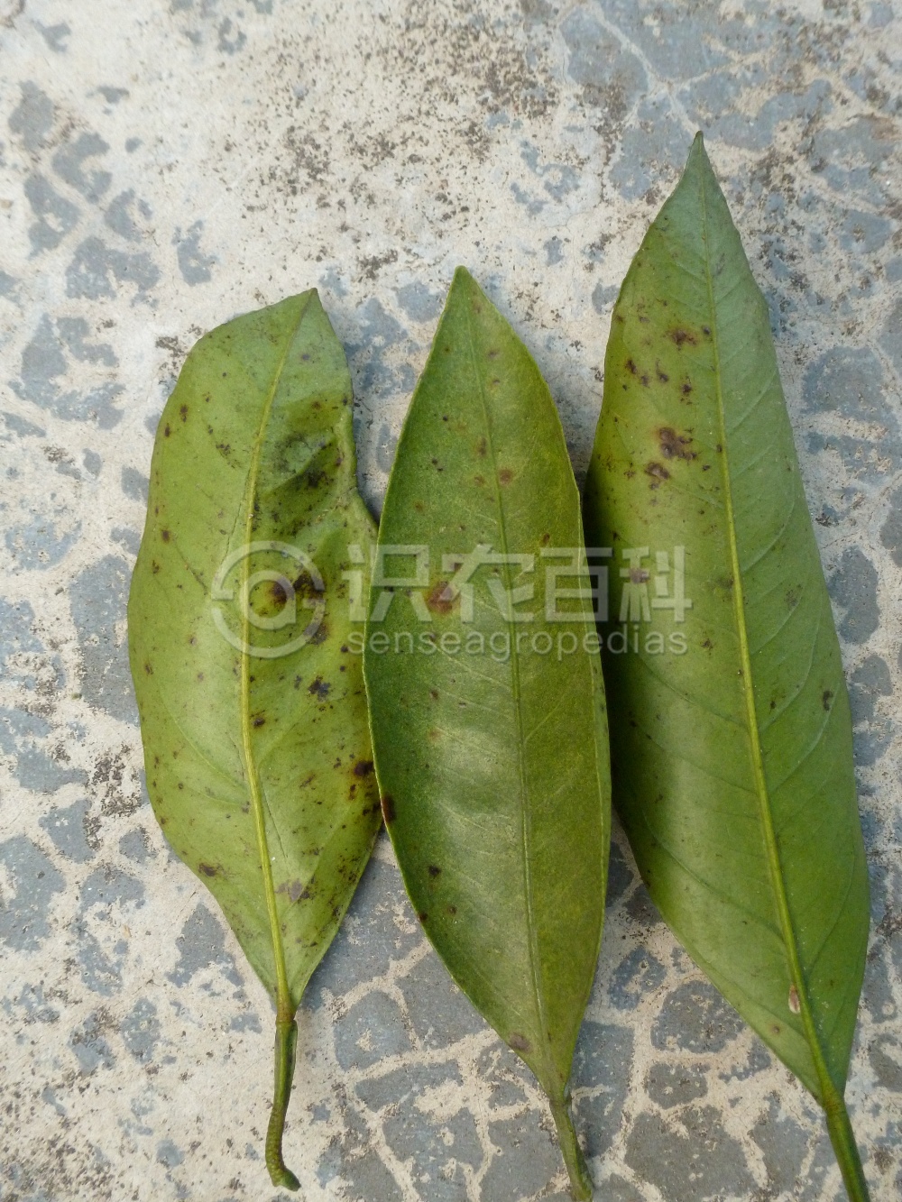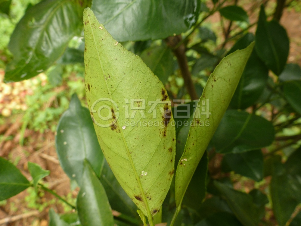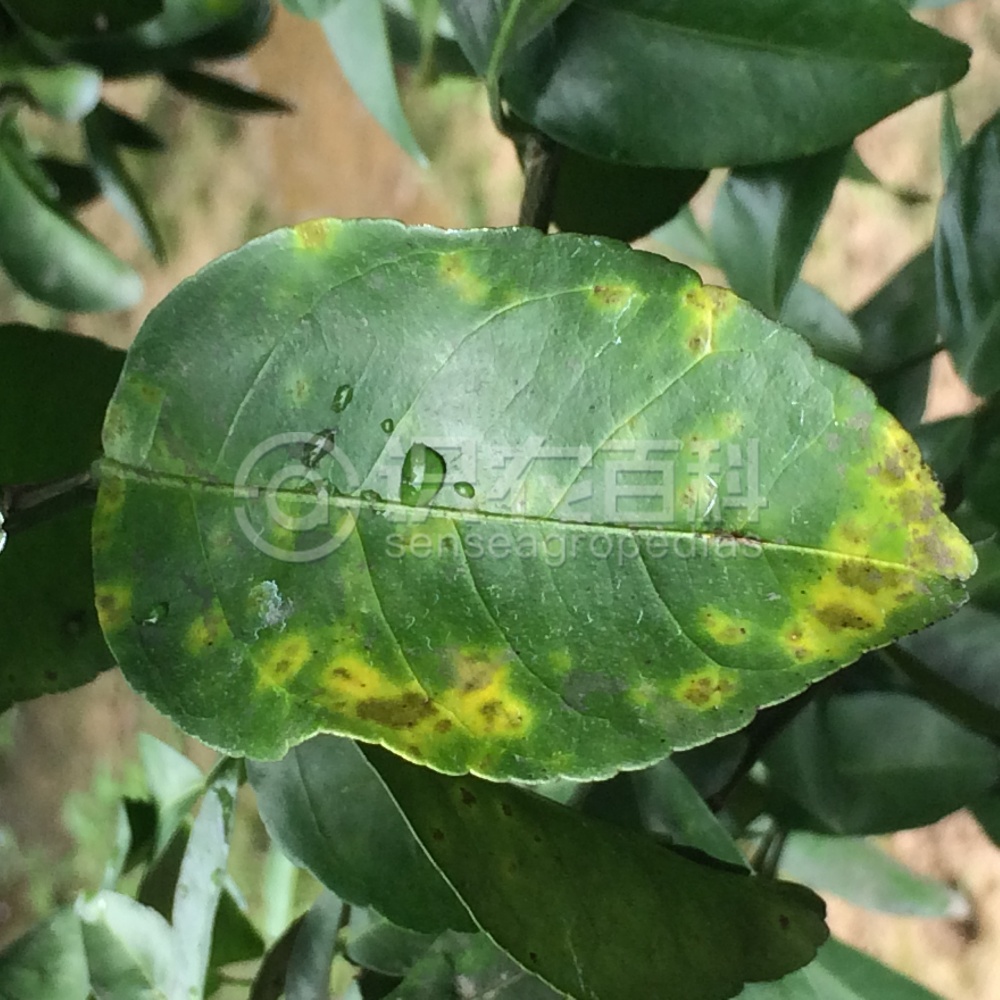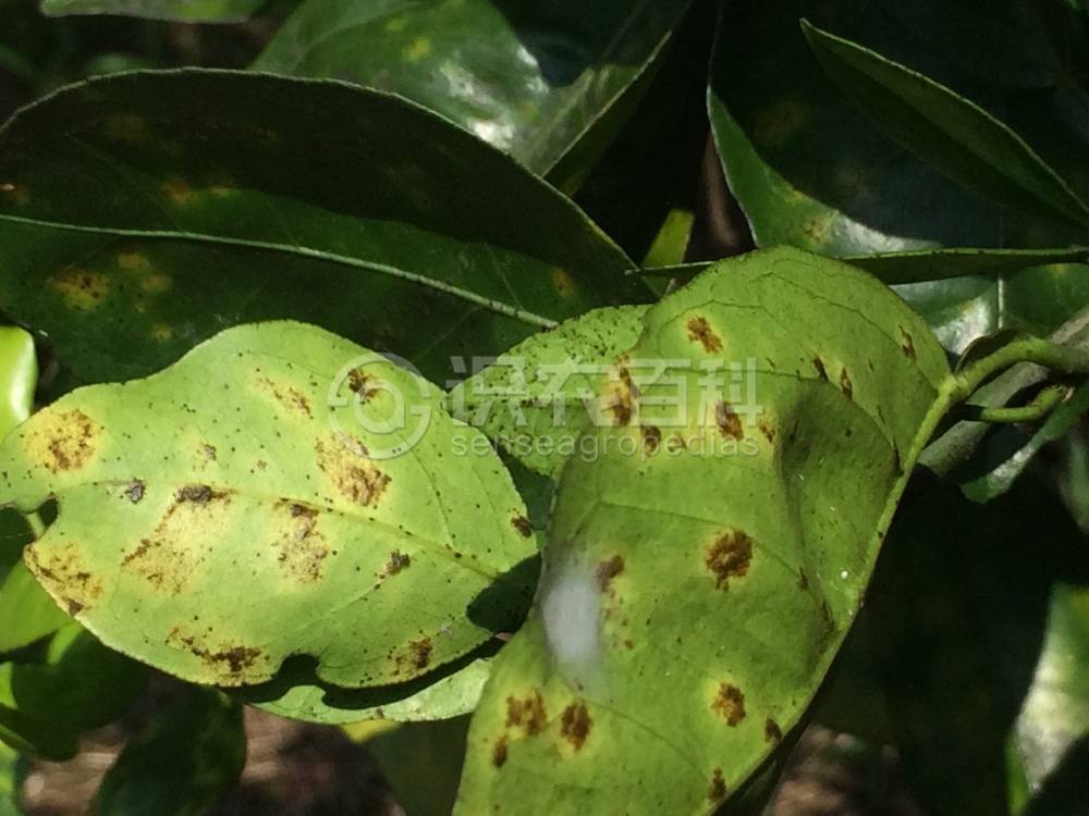 (3)混合型:在同一张病叶上,同时发生脂点黄斑型和褐色小圆星型的病斑。夏梢受侵染后,最容易在叶片上出现混合型症状。果实受侵染后,在果皮上出现褐色小斑点,病菌不侵入果肉。