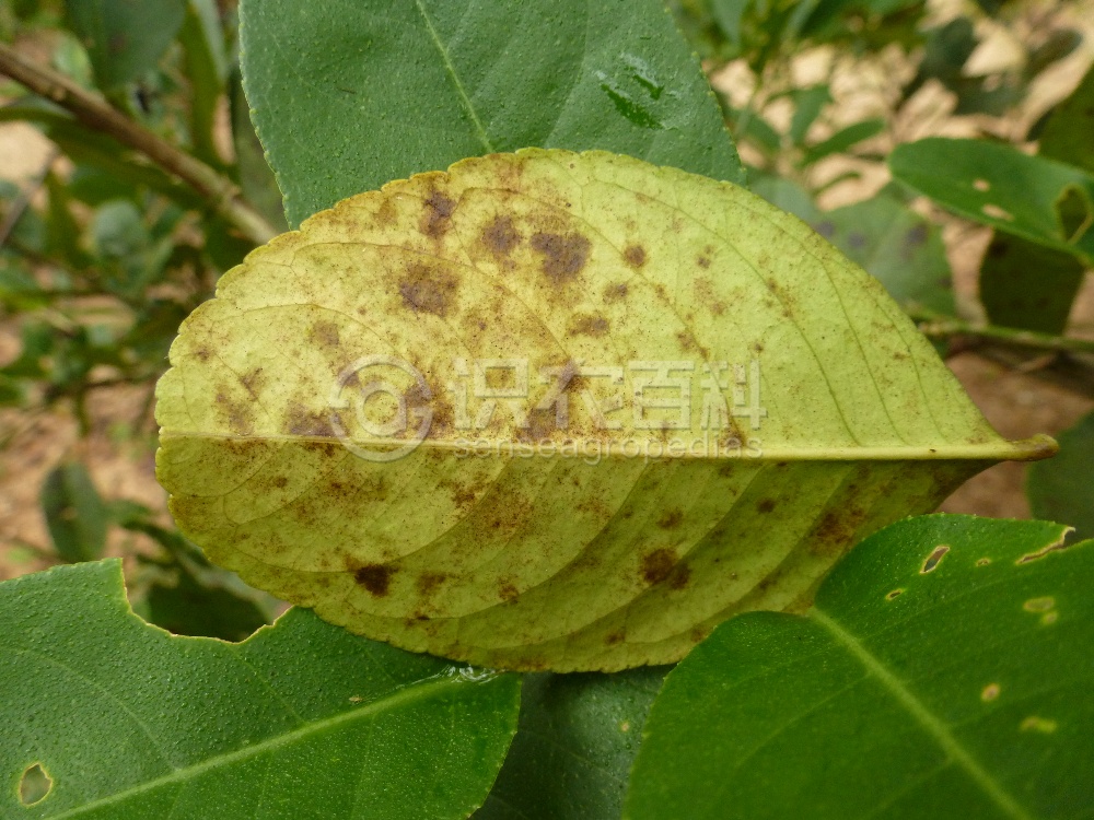 (2)褐色小圆星型:初期叶片表面出现赤褐色芝麻粒大小的近圆形斑点,后成圆形或椭圆形病斑,灰褐色,边缘颜色深且隆起,中间的色泽稍淡且凹陷,后期呈灰白色,其上布满黑色小粒点。秋梢叶片上病斑为褐色小圆星型。