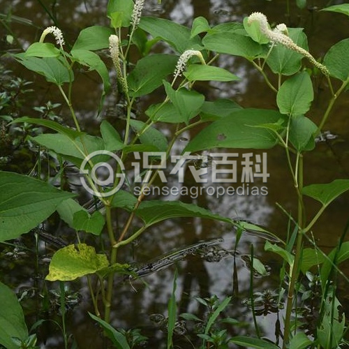 湿生草本,高约1米余;茎粗壮,有纵长粗棱和沟槽,下部伏地,常带白色,上部直立,绿色。叶纸质,密生腺点,阔卵形至卵状披针形,长10-20厘米,宽5-10厘米,顶端短尖或渐尖,基部心形或斜心形,两面均无毛,上部的叶较小,茎顶端的2-3片于花期常为白色,呈花瓣状; 叶脉5-7条,均自基部发出,如为7脉时,则最外1对纤细,斜升约2-2.5厘米即弯拱网结,网状脉明显;叶柄长1-3厘米,无毛,基部与托叶合生成鞘状,略抱茎。花序白色,长12-20厘米;总花梗长3-4.5厘米,无毛,但花序轴密被短柔毛; 苞片近匙形,上部圆,无毛或有疏缘毛,下部线形,被柔毛,且贴生于花梗上;雄蕊6枚,花药长圆形,纵裂,花丝比花药略长。果近球形,直径约3毫米,表面多疣状凸起。花期4-6月。