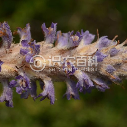 株高(-10)15-40(-50)厘米,全株密被蛛丝状长绵毛。茎直立,不分枝,具明显的条纹,基部常稍膨大。叶干后黄褐色,生于茎下部的较密集,上部的渐变稀疏,卵状披针形,长1.5-2厘米,宽5-7毫米,连同苞片和花萼外面及边缘密被蛛丝状长绵毛。花多数,排列成穗状花序,长10-20厘米,顶端钝圆或呈锥状;苞片与叶同形并近等大,先端尾状渐尖。花萼长1.2-1.5厘米,2深裂达近基部,每裂片中部以上再2浅裂,小裂片狭披针形,长3-5毫米,先端长尾状渐尖。花冠深蓝色、蓝紫色或淡紫色,长2-2.5厘米,筒部在花丝着生处稍上方缢缩,口部稍扩大;上唇2浅裂,极少顶端微凹,下唇3裂,裂片近圆形或长圆形,中间的较大,顶端钝圆,边缘具不规则小圆齿。雄蕊4枚,花丝着生于筒中部,长约1-1.2厘米,基部略增粗,常被长柔毛,花药卵形,长约2毫米,无毛。雌蕊长1.5-1.7厘米,子房椭圆体状或圆柱状,花柱与花丝近等长,常无毛,柱头常2浅裂。蒴果卵状长圆形或圆柱形,干后深褐色,长约1厘米,直径0.4厘米。种子多数,干后黑褐色,不规则椭圆形或长卵形,长约0.3毫米,直径0.15毫米,表面具网状纹饰,网眼底部具蜂巢状凹点。花期4-7月,果期7-9月。