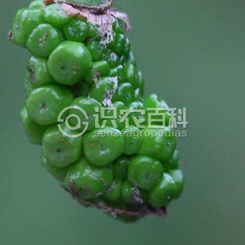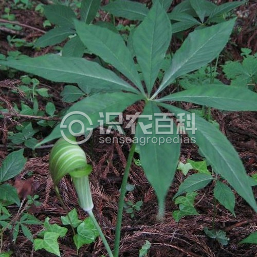块茎扁球形,直径可达6厘米,表皮黄色,有时淡红紫色。鳞叶绿白色、粉红色、有紫褐色斑纹。叶1,极稀2,叶柄长40-80厘米,中部以下具鞘,鞘部粉绿色,上部绿色,有时具褐色斑块;叶片放射状分裂,裂片无定数;幼株少则3-4枚,多年生植株有多至20枚的,常1枚上举,余放射状平展,披针形、长圆形至椭圆形,无柄,长(6-)8-24厘米,宽6-35毫米,长渐尖,具线形长尾(长可达7厘米)或否。花序柄比叶柄短,直立,果时下弯或否。佛焰苞绿色,背面有清晰的白色条纹,或淡紫色至深紫色而无条纹,管部圆筒形,长4-8毫米,粗9-20毫米;喉部边缘截形或稍外卷;檐部通常颜色较深,三角状卵形至长圆状卵形,有时为倒卵形,长4-7厘米,宽2.2-6厘米,先端渐狭,略下弯,有长5-15厘米的线形尾尖或否。肉穗花序单性,雄花序长2-2.5厘米,花密;雌花序长约2厘米,粗6-7毫米;各附属器棒状、圆柱形,中部稍膨大或否,直立,长2-4.5厘米,中部粗2.5-5毫米,先端钝,光滑,基部渐狭;雄花序的附属器下部光滑或有少数中性花;雌花序上的具多数中性花。雄花具短柄,淡绿色、紫色至暗褐色,雄蕊2-4,药室近球形,顶孔开裂成圆形。雌花:子房卵圆形,柱头无柄。果序柄下弯或直立,浆果红色,种子1-2,球形,淡褐色。花期5-7月,果9月成熟。