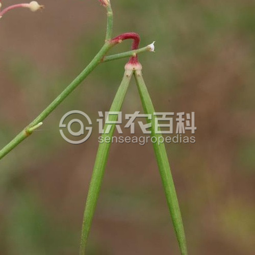 高0.5-2米,基部木质化;茎黄绿色,有条纹;小枝倾向茎的中轴,幼嫩部分与苞片、小苞片、花梗、花萼的外面均被灰褐色柔毛,尤其在花梗及花萼外面为密。叶坚纸质,互生,稀在茎的上部对生,线形至线状披针形,长1.5-3.5厘米,宽0.3-0.8厘米(最小的0.8 × 0.15厘米,最大的4.5 × 0.8厘米),先端渐尖,狭成急尖头,基部楔形,边缘具细牙齿,表面具颗粒状突起;中脉在叶背略为隆起,侧脉每边约 15条左右,幼嫩时不明显;叶柄长2-5毫米。圆锥状的聚伞花序一至多歧,顶生;苞片及小苞片披针形,长约3毫米,宽约1毫米;花梗老时向下弯曲,长5-7毫米;花萼5裂,下部合生,内无腺体,裂片卵圆状三角形,长约1.5毫米,宽约1毫米;花冠骨盆状,粉红色,长达1.5厘米,直径1.5厘米,稀达2厘米,裂片5枚,每裂片有三条深紫色条纹,宽三角形,先端钝或圆形,长约4.5毫米,宽约5毫米;副花冠着生在花冠筒的基部,裂片5枚,三角形,基部合生,上部离生,先端长渐尖凸起;雄蕊5枚,与副花冠裂片互生,花丝短,被茸毛,花药箭头状,先端急尖,基部具耳,耳基部紧接或重叠;花盘肉质环状,高及子房的三分之一至二分之一;子房半下位,由2枚离生心皮所组成,基部埋藏于花托中,花柱圆柱状,柱头顶端钝,2裂,基部盘状。蓇葖2枚,平行或略为叉生,倒垂,长17-24.5厘米,直径3-4毫米,外果皮灰褐色,有细纵纹;种子红褐色,长圆形,长2-3毫米,顶端具一簇白色绢质种毛;种毛长约2厘米。花期4-9月(盛开期6、7月),果期7-12月(成熟期9、10月)。