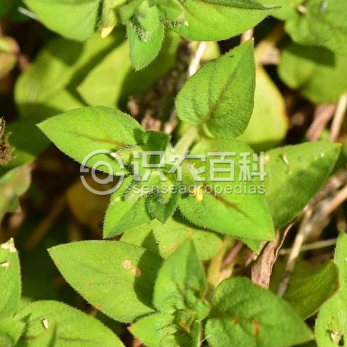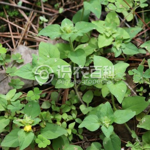 茎下部匍匐,节上生根,上部及分枝上升,长6-50厘米,圆柱形,密被多细胞卷曲柔毛;分枝纤细,有时仅顶端具叶。叶对生,茎端的2对间距短,近密聚,叶片卵形、阔卵形以至近圆形,近等大,长 (0.7) 1.4-3 (4.5) 厘米,宽 (0.6) 1.3-2.2 (3) 厘米,先端锐尖或钝,基部近圆形或截形,稀略呈心形,上面绿色,下面较淡,有时沿中肋和侧脉染紫红色,两面多少被具节糙伏毛,稀近于无毛,近边缘有暗红色或有时变为黑色的腺点,侧脉2-4对,在下面稍隆起,网脉纤细,不明显;叶柄比叶片短2-3倍,具草质狭边缘。花2-4朵集生茎端和枝端成近头状的总状花序,在花序下方的1对叶腋有时具单生之花;花梗极短或长至2毫米;花萼长5-8.5毫米,分裂近达基部,裂片披针形,宽约1.5毫米,背面被疏柔毛;花冠黄色,内面基部紫红色,长9-11毫米,基部合生部分长2-3毫米,5裂(偶有6裂的),裂片卵状椭圆形至长圆形,宽3-6.5毫米,先端锐尖或钝,散生暗红色或变黑色的腺点;花丝下部合生成高约2.5毫米的筒,分离部分长2.5-4.5毫米;花药长圆形,长约1.5毫米;花粉粒近长球形(30-36) × (26.5-29)微米〕,表面具网状纹饰;子房被毛,花柱长5-7毫米。蒴果球形,直径3-4毫米。花期5-6月;果期7-10月。