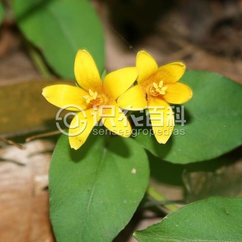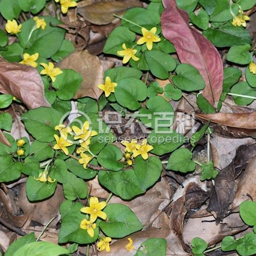 多年生草本,茎柔弱,匍匐地面。叶对生,叶柄于叶片约等长;叶片心形或宽卵形,先端钝尖或钝形,基部心形或近圆形,全缘,两面均有黑色腺条,主脉1,于叶背面隆起。花成对腋生;花冠5裂,黄色。有黑色短腺条。蒴果球形。花期5-7月,果期6-8月