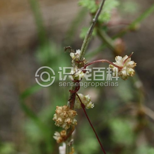 茎纤细,毛发状,直径不超过1毫米。花序侧生,少花或通常多花密集成团伞花序,花无柄;花萼杯状,长2-2.5毫米,中部或中部以上分裂,裂片覆瓦状排列,近于扁菱形,背部以至顶端肉质增厚,干后有时金黄色发亮;花冠白色,钟状,长2-2.5毫米,裂片开展,三角状卵形,顶端钝,短于花冠筒;雄蕊着生花冠喉部,比花冠裂片短,花药卵状圆形,和花丝近等长或稍短;鳞片长圆形,长不达花丝基部,或有时超过花丝基部与花冠筒近等长,顶端钝圆或2裂,边缘短流苏状;子房近球形,花柱和柱头与子房近等长或稍长,柱头棒状,有时向下弯曲,长于或等于花柱。蒴果近球形,周裂,包藏在凋存的花冠内。种子卵形,长不及1毫米。